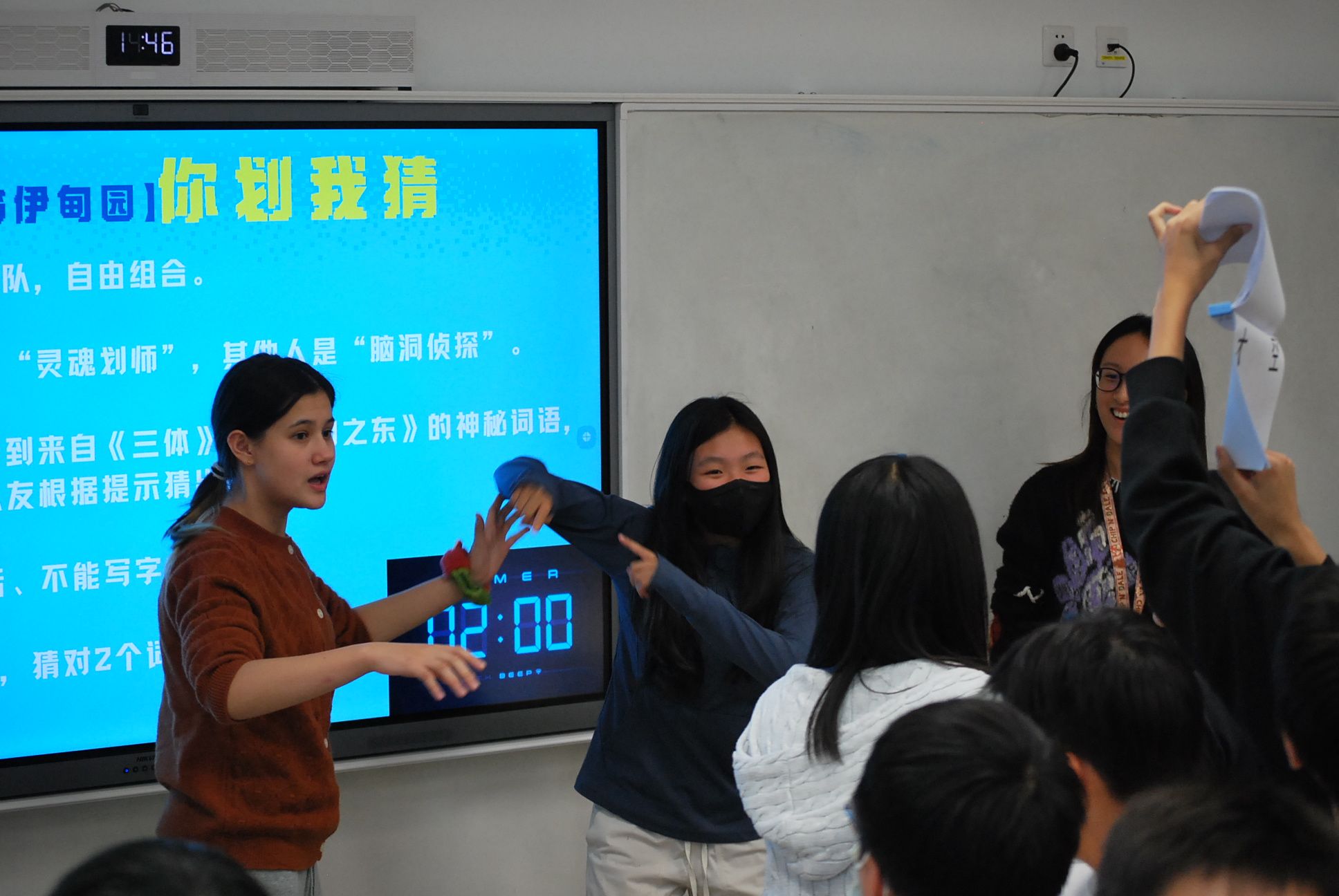 十二月的阅读嘉年华是整个系列活动的高潮。活动分为“游园会”和“颁奖典礼”两部分。在上课铃敲响前,各班教室早已布置成各具特色的阅读主题空间。有的班级在黑板上画满书中场景,有的则在门口挂起自制海报。三大House的活动在各自楼层展开,同学们拿着阅读护照穿梭在不同年级的教室里,收集印章、参与游戏、体验不同班级的创意。《三国演义》与《西游记》的篇章被巧思改编成“角色竞猜”与“情节排序”的趣味挑战;《哈利·波特》《迷宫行者》等构建的奇幻世界,则通过“密室解谜”“迷宫生存”等沉浸式游戏吸引着探险者。科幻与推理专区同样引人入胜:《三体》的宏大叙事激发了“宇宙插图创作”的热情,《东方快车谋杀案》等经典则化身“侦探剧场”,邀请同学们在互动演绎中抽丝剥茧。不同展区间流淌着鲜活的思想碰撞。有人围在“插画角”安静绘制心中的故事场景,有人在“快问快答”区为书中细节激烈抢答,还有人在“解忧信箱”前写下读后感、与书中人物隔空对话。同学们手持阅读护照穿梭其间,集章打卡,不仅重温了本学期书单中的精华,更在互动中深化了对文本的理解与共鸣。