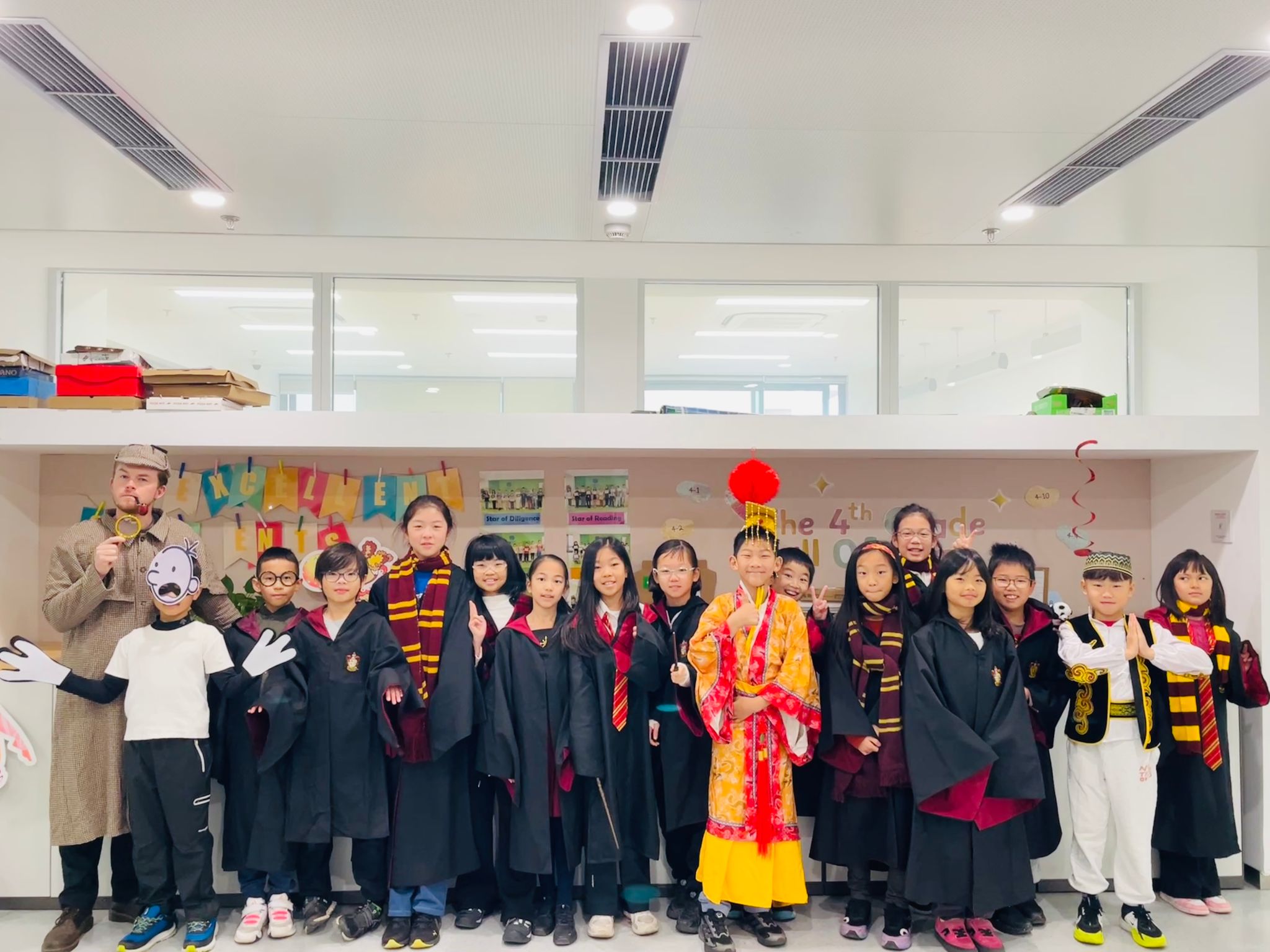 周三的教学楼华丽蜕变为文学人物的奇幻秀场。同学们装扮成各类英语文学作品中的角色:这边是手持魔杖的“哈利·波特”正低声念诵咒语,那边则有扑扇着闪闪发光翅膀的小仙子穿过走廊......午间,同学们还精心制作了马戏团海报风格的角色展板,当文学作品中的角色走出书页,不仅点燃了同学们的阅读热情,更让经典人物蕴含的精神力量在孩子们眼中真正苏醒。