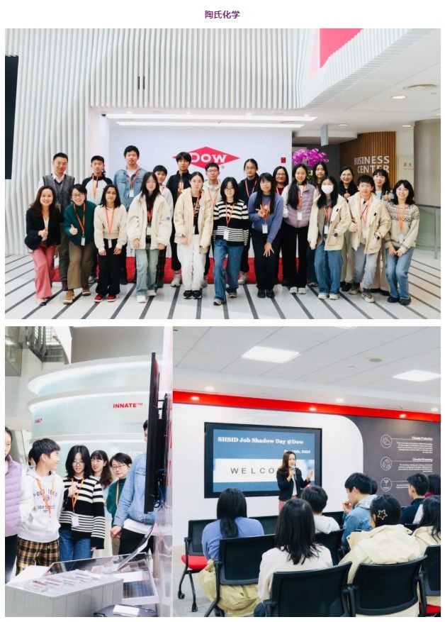 “这次职业体验日,我们参观了陶氏化学公司,对化学行业有了新的认识。之前我一直以为学化学只是为了生产化学品和做实验,但通过这次参观与听完这些讲座,我发现化学是我们生活中必不可少的一部分,许多日常用品都离不开陶氏化学的产品——比如防水夹克的表面接触胶,不粘锅耐温材料,口红的原料。活动中,我们还有机会亲手接触金属硅以及不同粘度的有机硅产品(硅油、硅凝胶、硅树脂),让我对材料有了更直观的感受。除了丰富的讲座,我们参观了他们的工作区、实验室、以及健身休息的设施,整体体验非常有趣也学到了许多新知识。”——9-3 Katie
