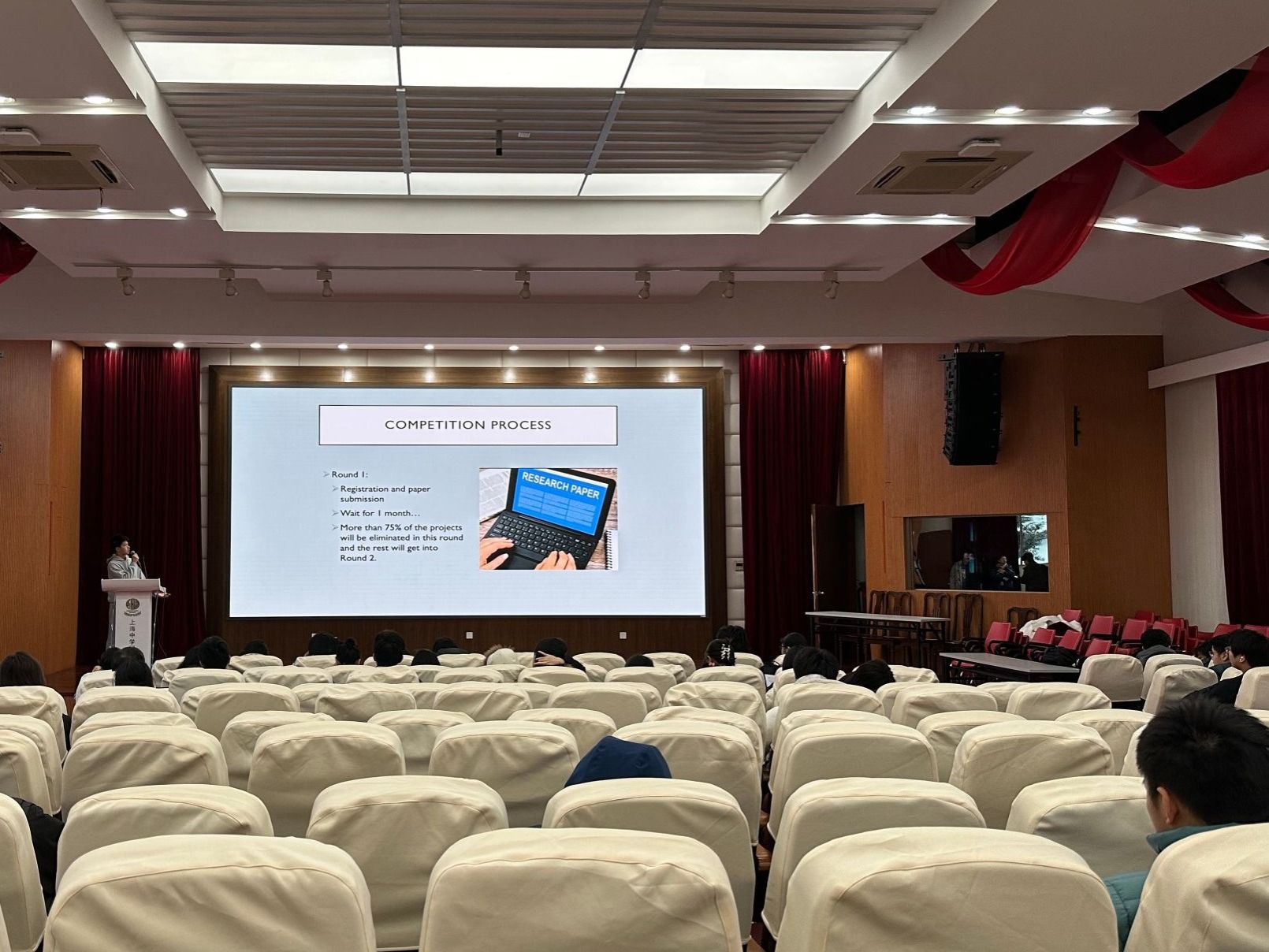 12月18日,十一年级晨会在先棉堂礼堂举行。Simon 率先分享了自己征战丘成桐科学创新竞赛的宝贵经验。他将整个赛程拆解为三个核心环节,细致入微地讲解了各阶段的备赛关键要点。