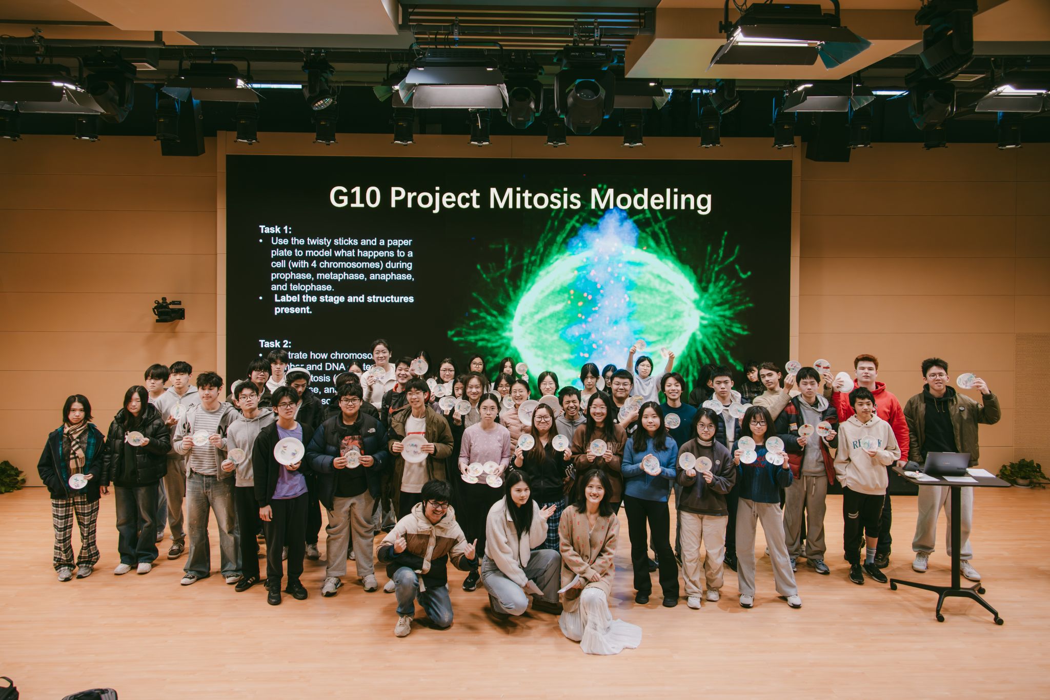 2025年12月19日,十年级生物教学班于中兴楼B1戏剧教室成功举办了有丝分裂模型搭建赛。学生需要使用扭扭棒等材料制作有丝分裂全过程模型,通过将抽象的有丝分裂过程转化为指尖可操作的动态评估,实现了考评方式从理论概念复现向动手实践的跨越。
