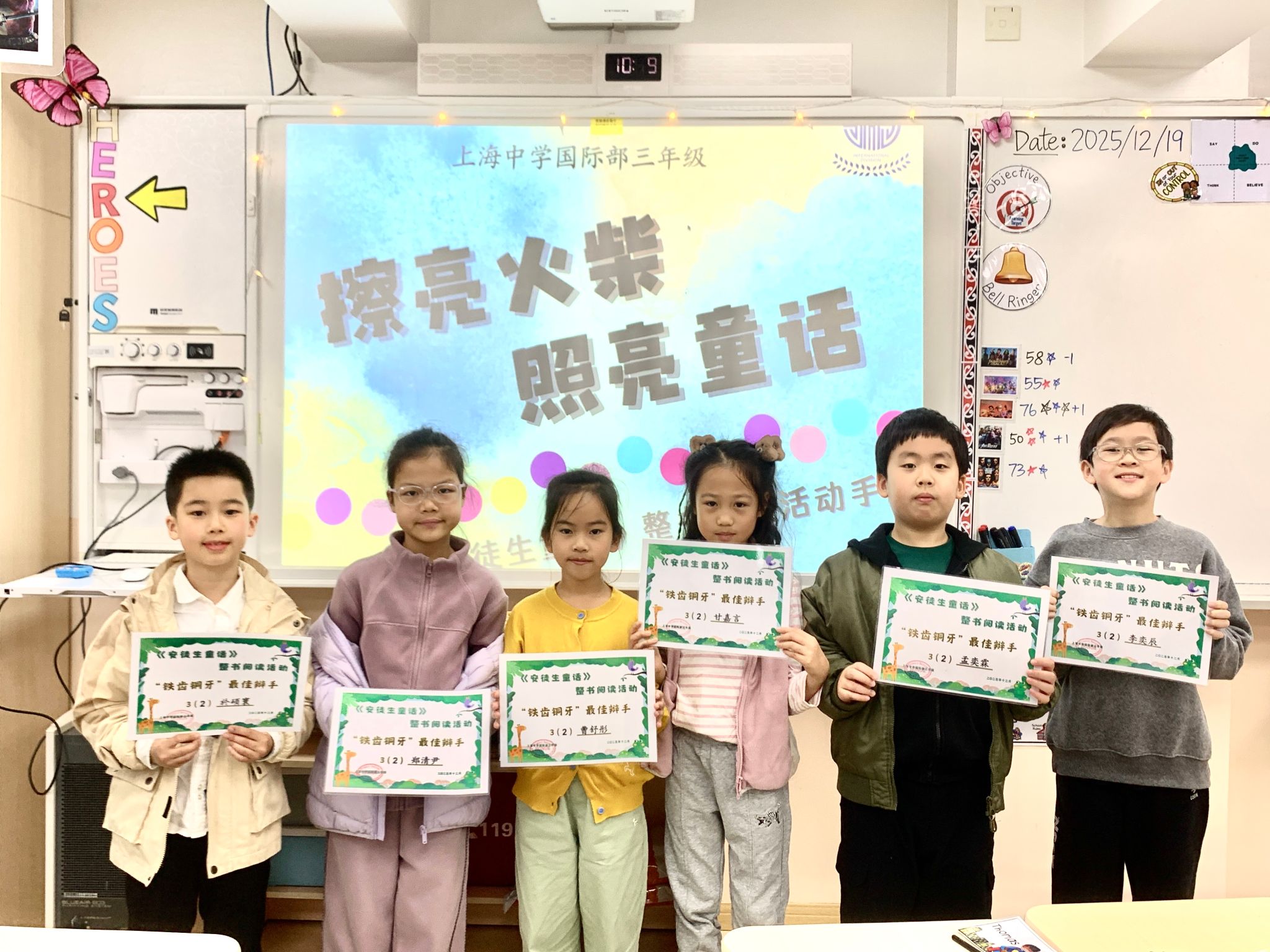 阅读周的最后一天,孩子们一起回顾了一周的精彩活动,分享自己最难忘的瞬间和最大的收获。根据孩子们在阅读、辩论、讲述与倾听中的表现,年级为学生颁发了多项童话主题奖状,如“童话阅读达人”、“金牌演说家”、“最佳聆听之星”、“铁齿铜牙最佳辩手”、“暖心话语魔法师”等,让每一份努力都被看见、被肯定。