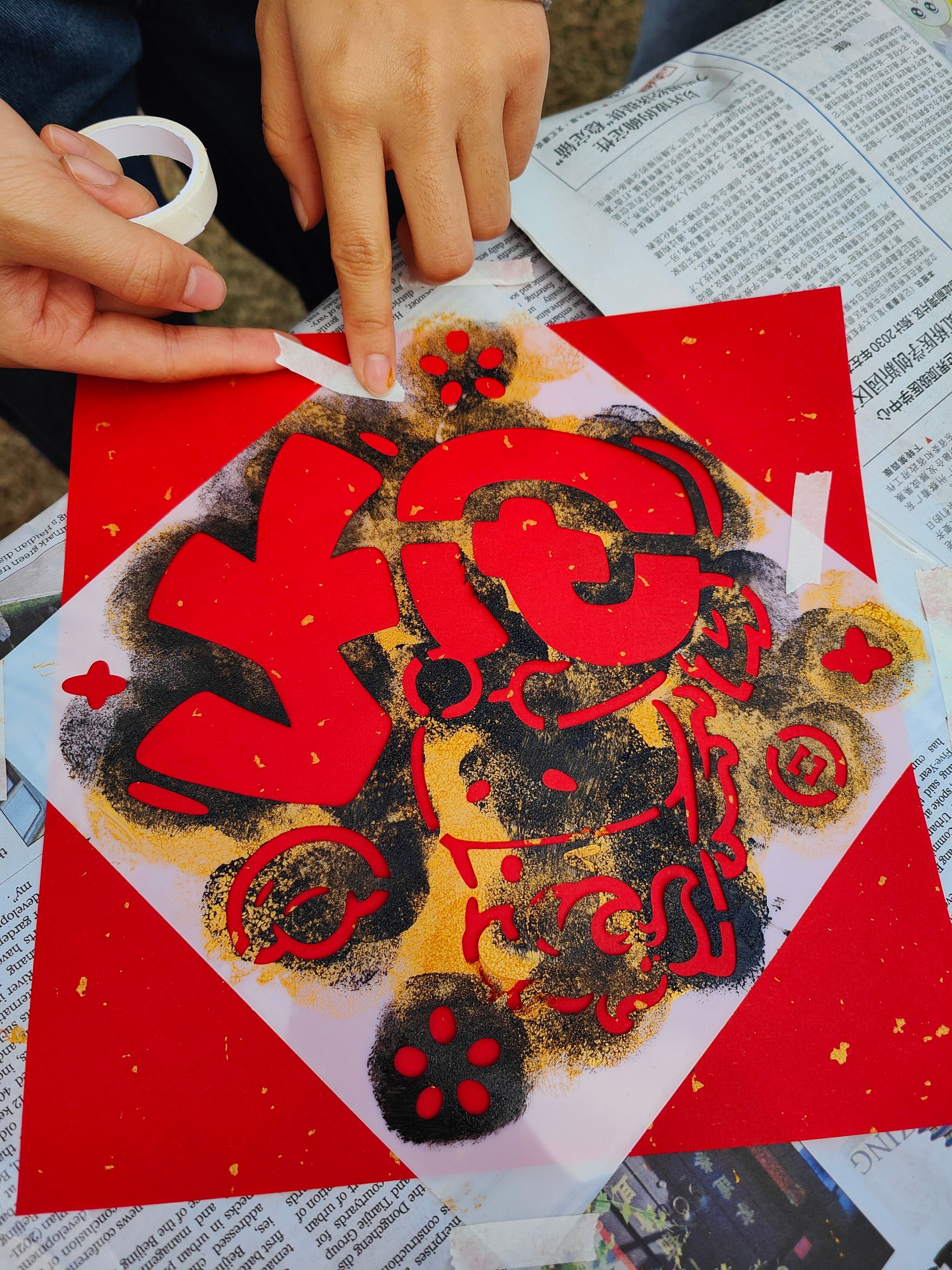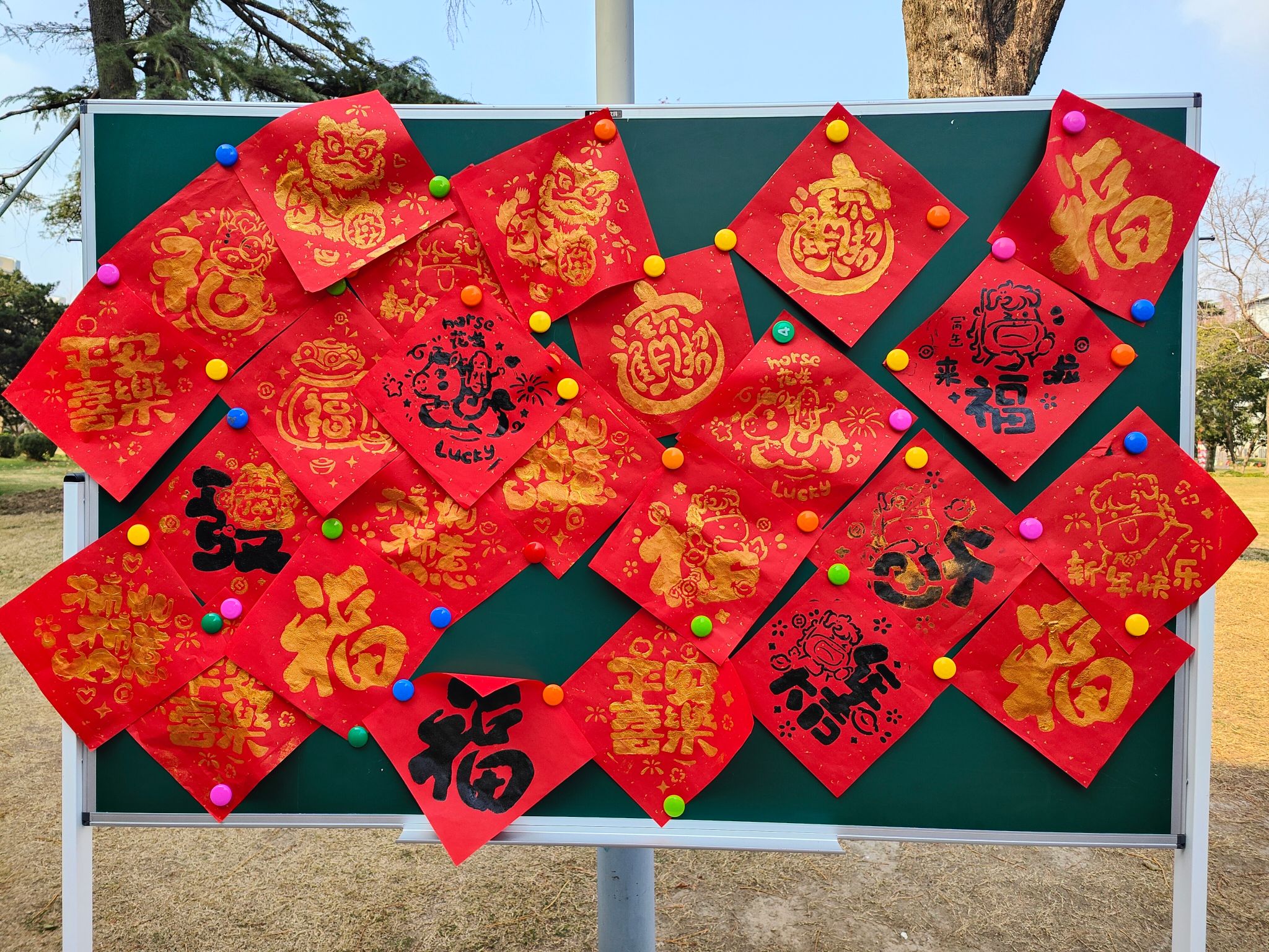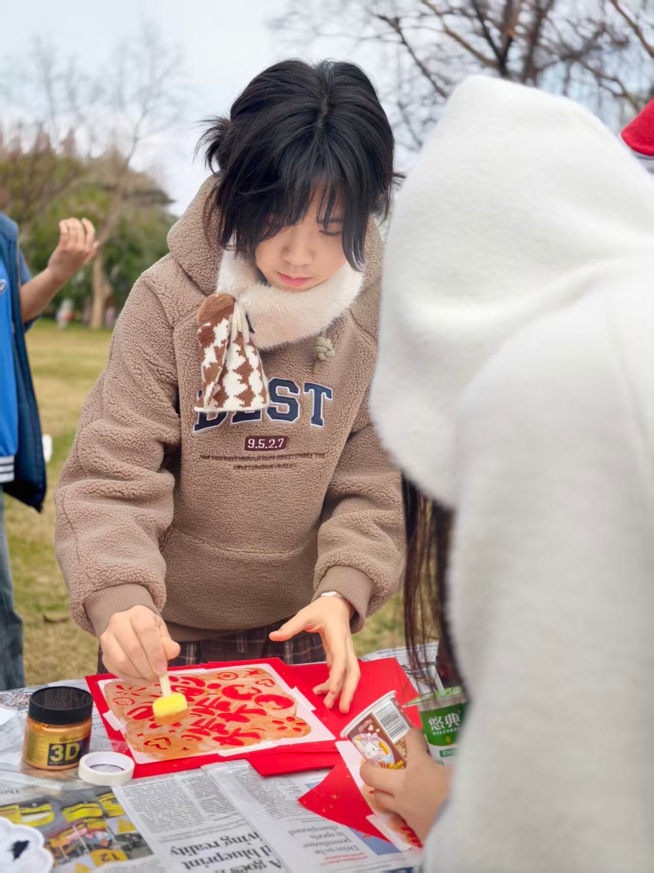 活动当天,中兴楼大草坪上的红色装饰与新年元素交相辉映,年味十足。“新春拓福”体验区前人气不断,同学们在学生志愿者的引导下,将福字模板固定于红纸上方,用海绵刷蘸取颜料轻轻拓印,耐心完成属于自己的“福”字作品。一次次细致的拍印,既是对传统文化的体验,也象征着将祝福与期许带入新的一年。