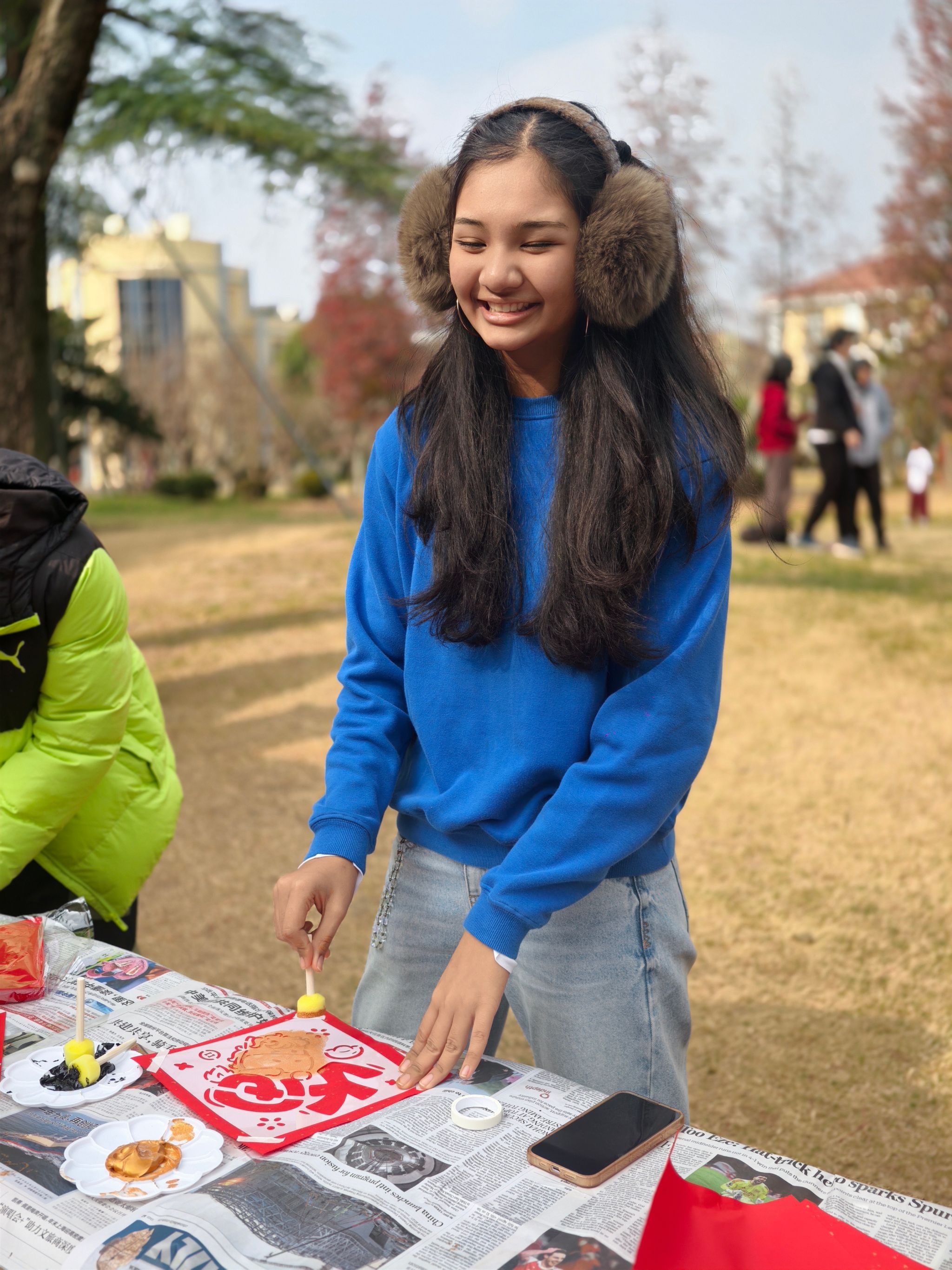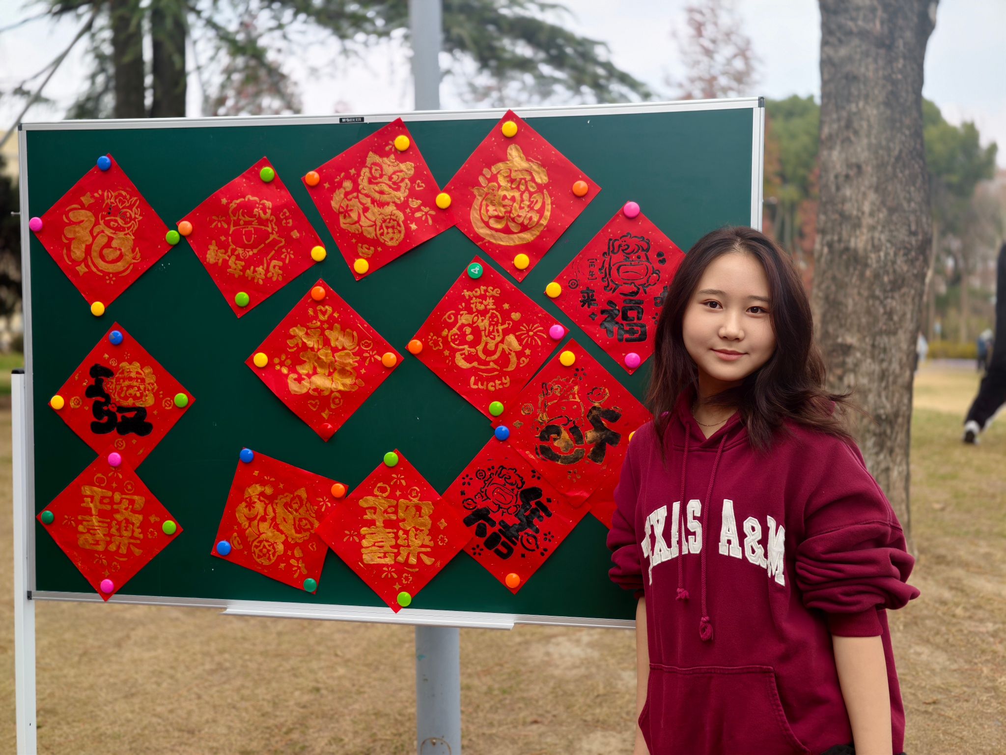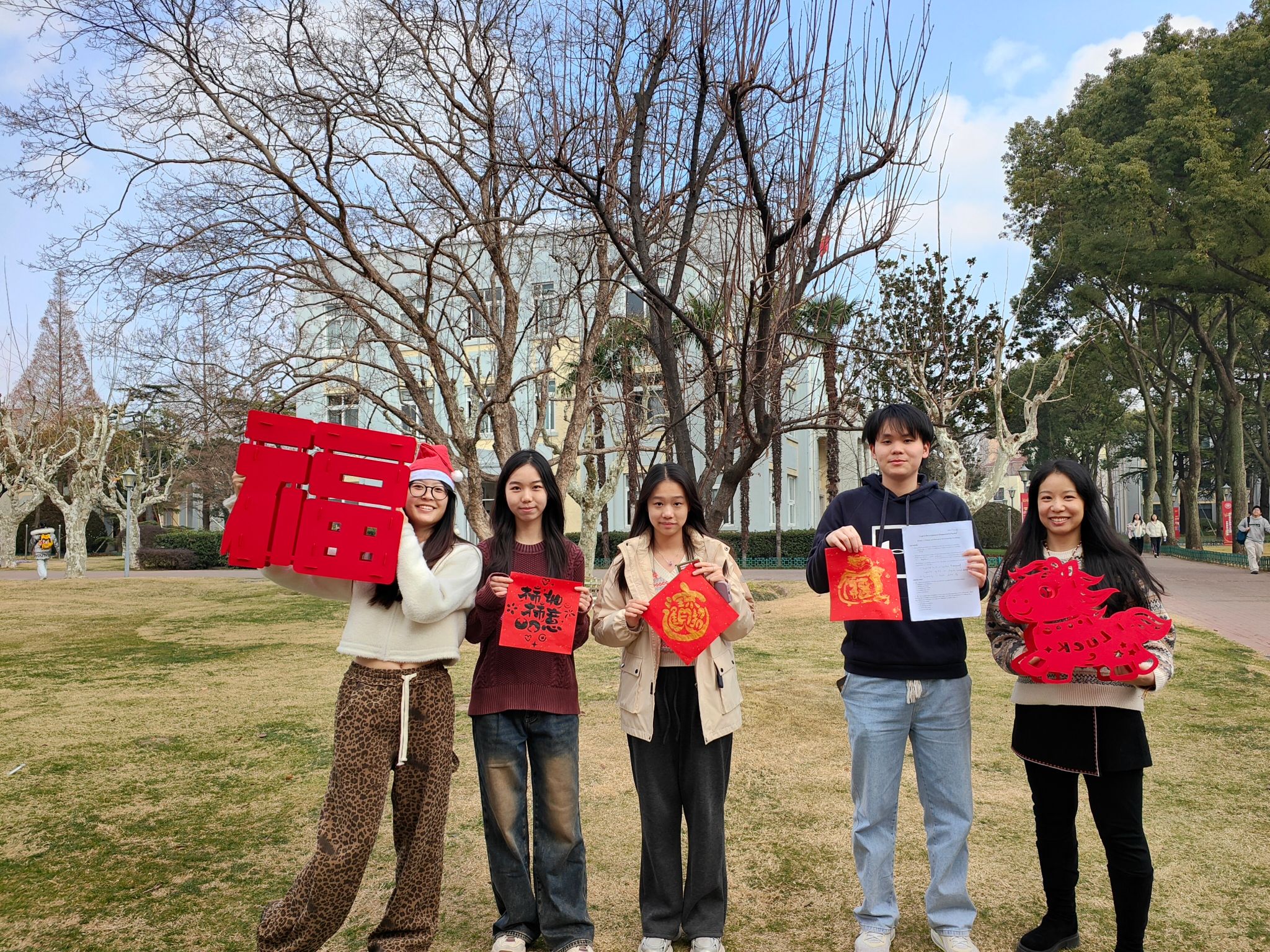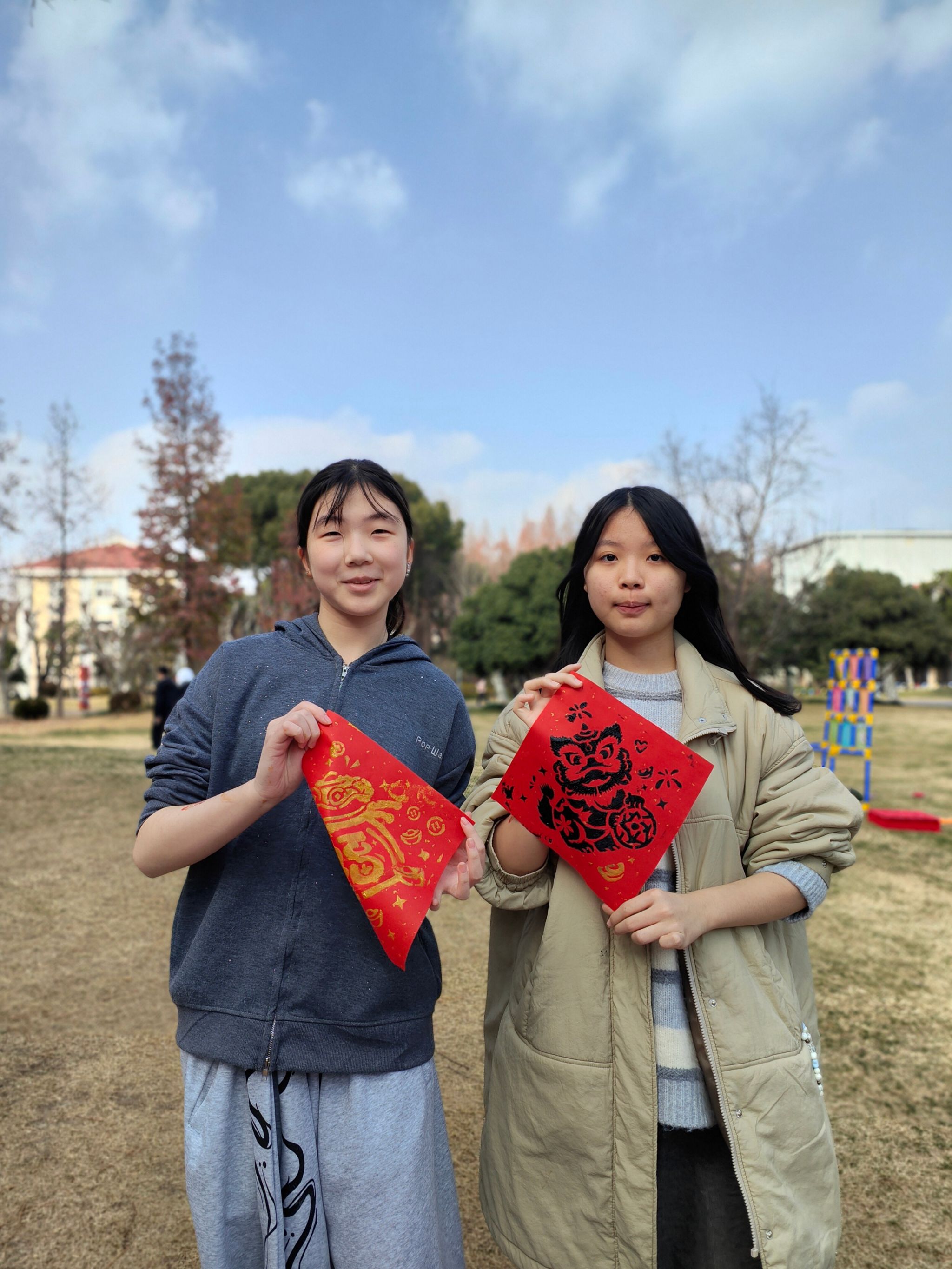 活动当天,中兴楼大草坪上的红色装饰与新年元素交相辉映,年味十足。“新春拓福”体验区前人气不断,同学们在学生志愿者的引导下,将福字模板固定于红纸上方,用海绵刷蘸取颜料轻轻拓印,耐心完成属于自己的“福”字作品。一次次细致的拍印,既是对传统文化的体验,也象征着将祝福与期许带入新的一年。