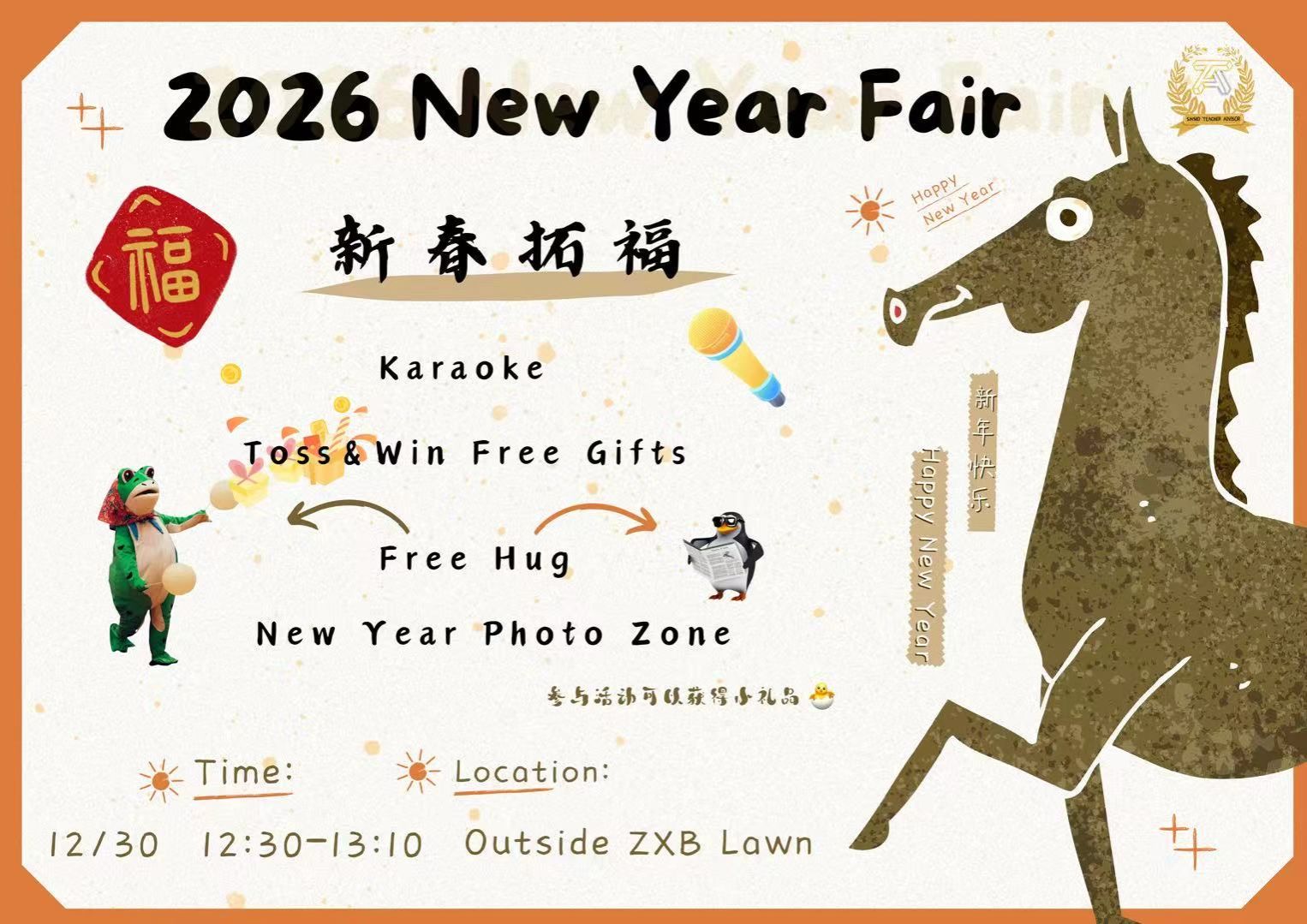 2025年12月30日中午,生涯指导办公室在中兴楼下大草坪举办了2026 New Year Fair心理放松解压活动。本次活动以“新春拓福”为主线,通过多样化、富有仪式感的互动体验,引导师生在学期末放慢脚步、整理情绪,在辞旧迎新之际为这一年画上温暖而充实的句号。