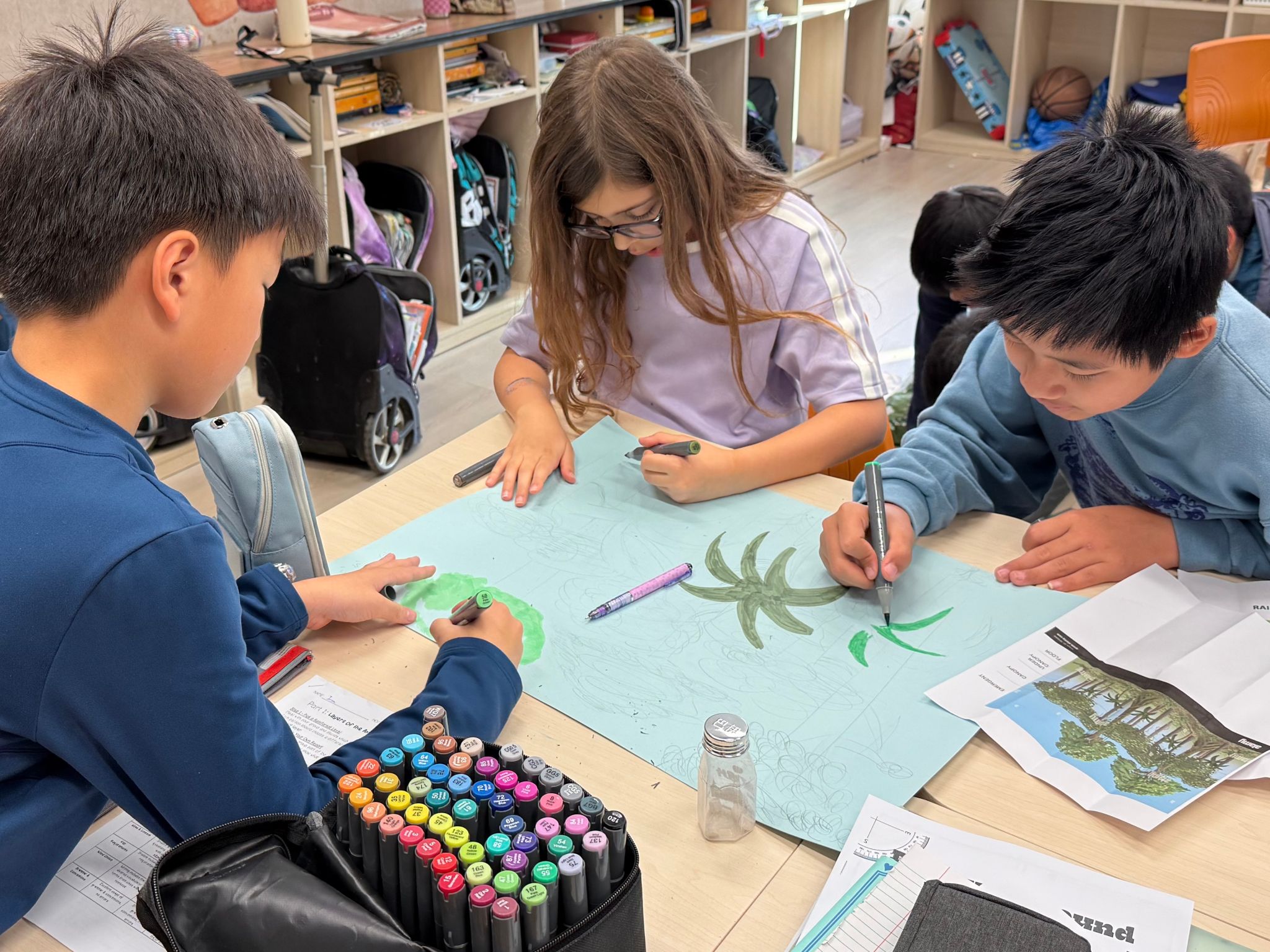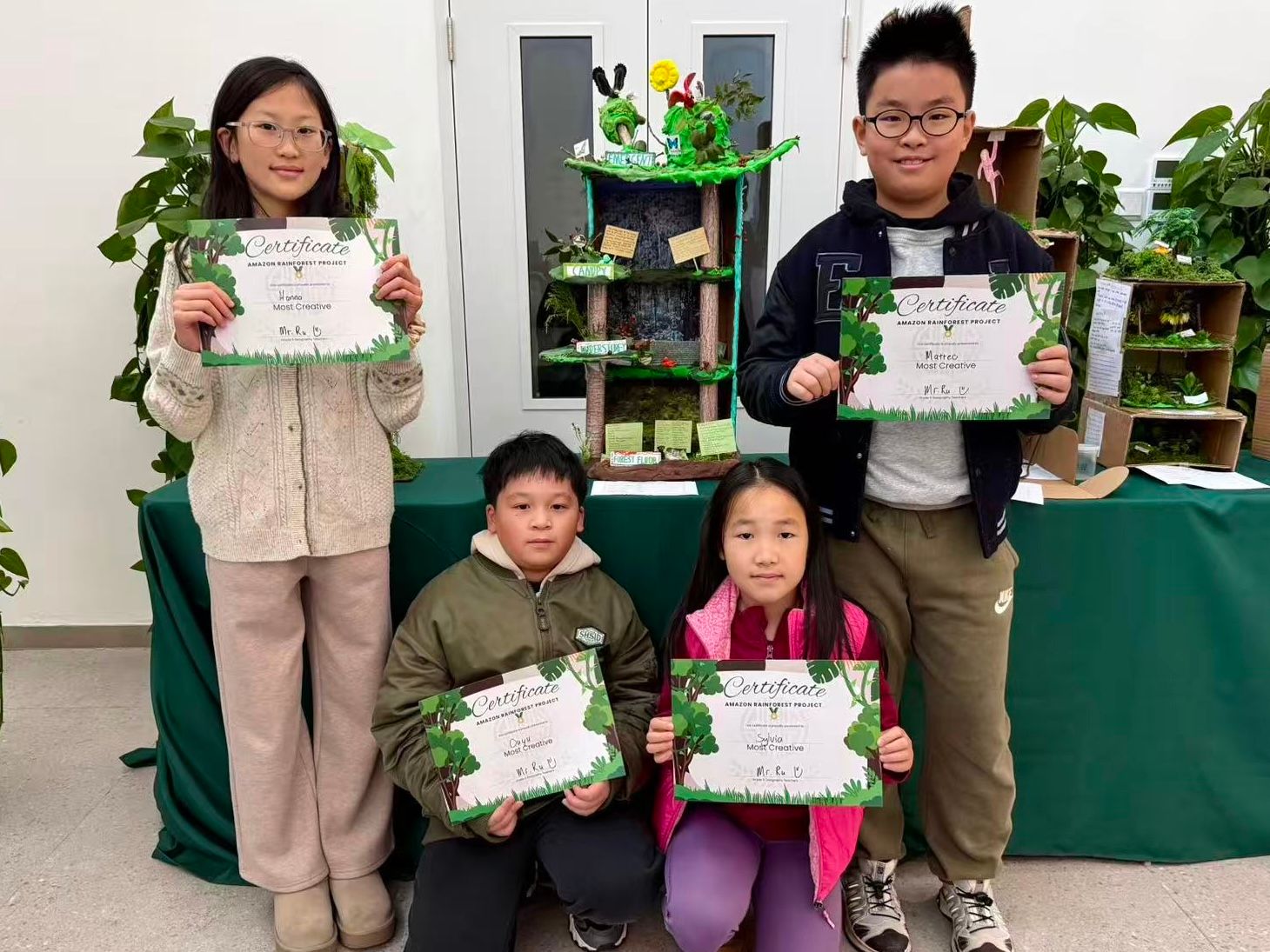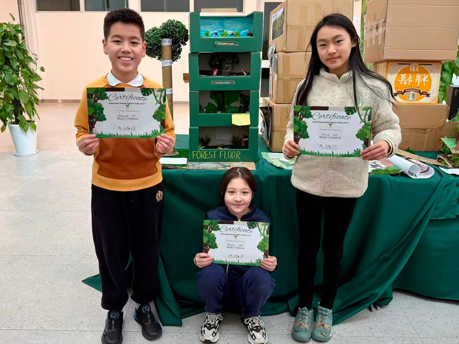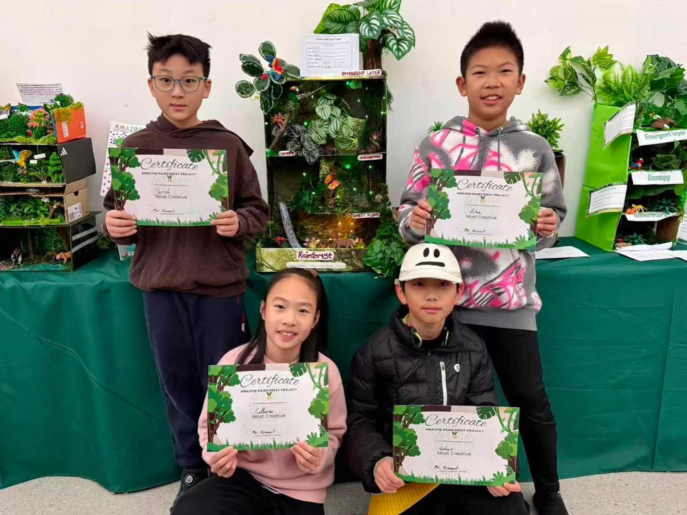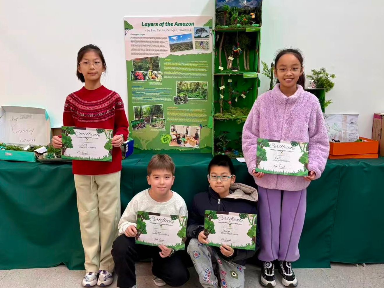 学生以小组形式,将个人研究成果整合,制作出创意十足且信息准确的雨林分层模型或海报。每件作品中都清晰标注了四个雨林层级,并呈现出关键事实以及各层典型的动植物,体现了良好的团队协作、问题解决能力和设计思维。