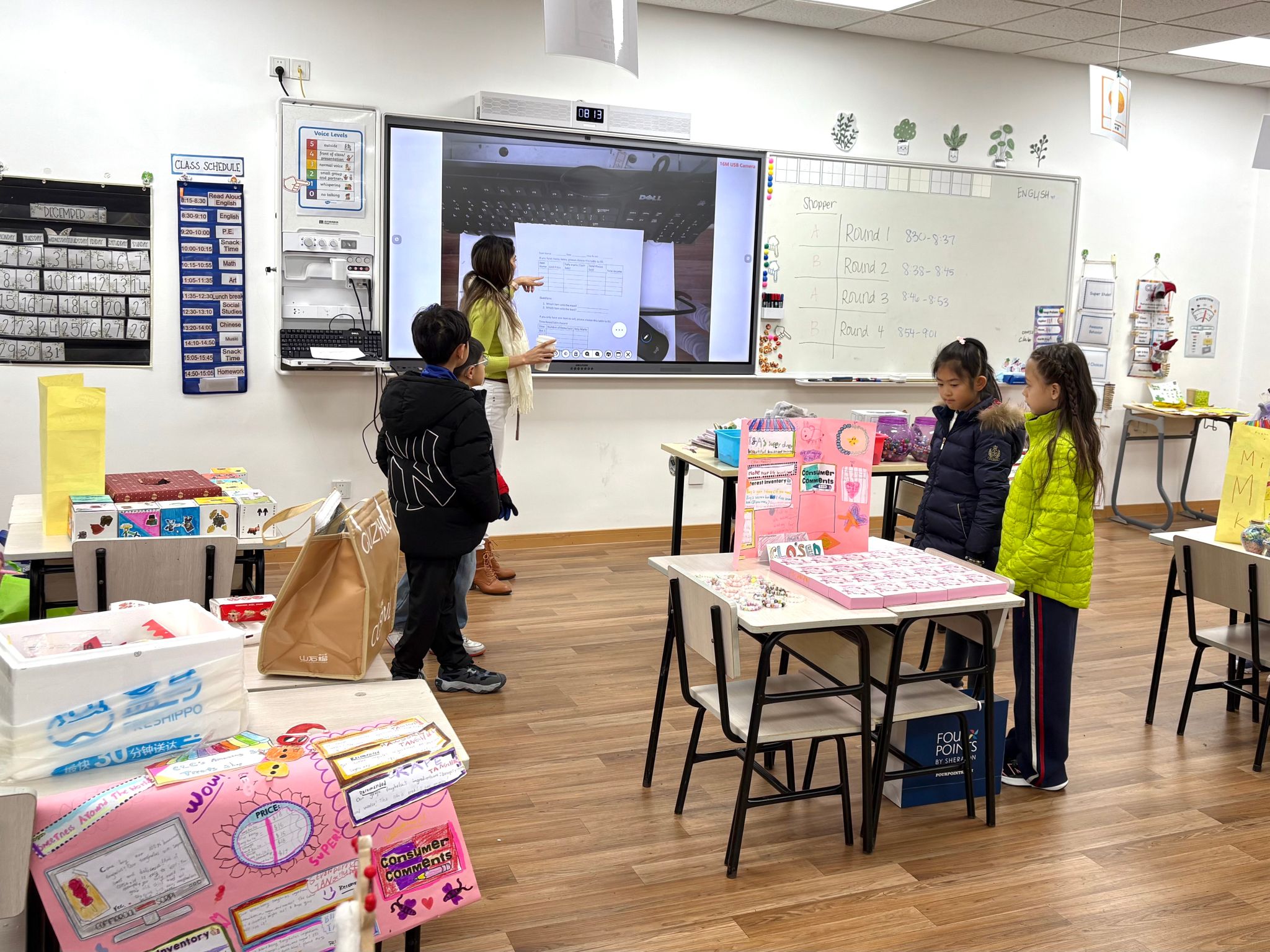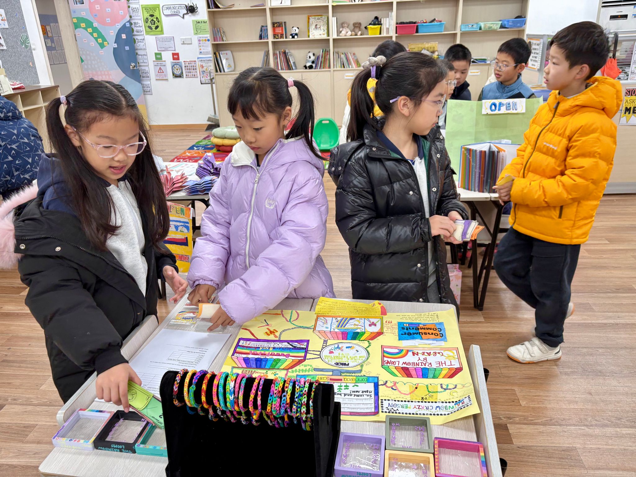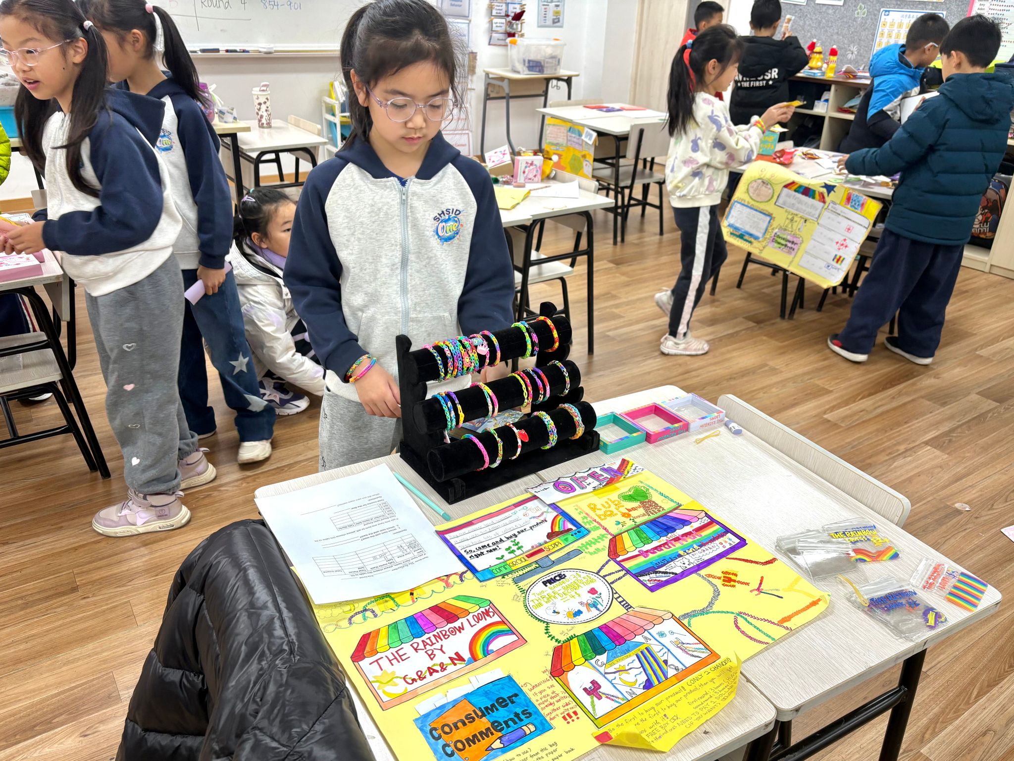 在为期数周的准备阶段,学生们系统学习了经济学基础、说服性表达及广告宣传的相关知识。随后,他们以“小生产者” 的身份投身实践,不仅自主开发“商品”、设计服务,还精心制作了专属广告海报——海报上清晰标注了团队 “公司名称”、专属标识及店铺宣传语,以此吸引其他同学购买自己的产品。集市活动期间,学生们与团队伙伴轮流承担 “卖家” 与 “买家” 角色:既负责推销自家商品,也可在指定预算内选购其他同学的“产品”,充分体验了生产与消费的双重过程。