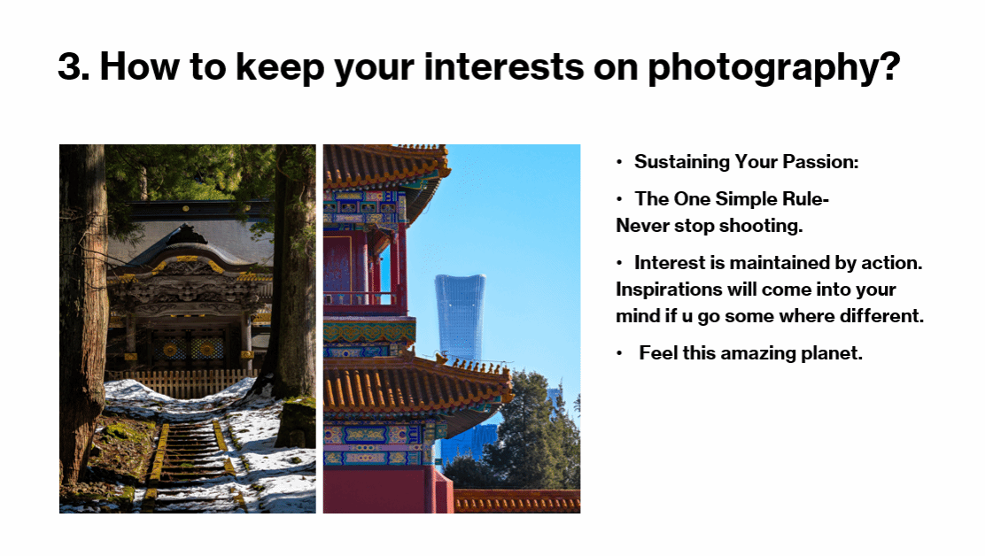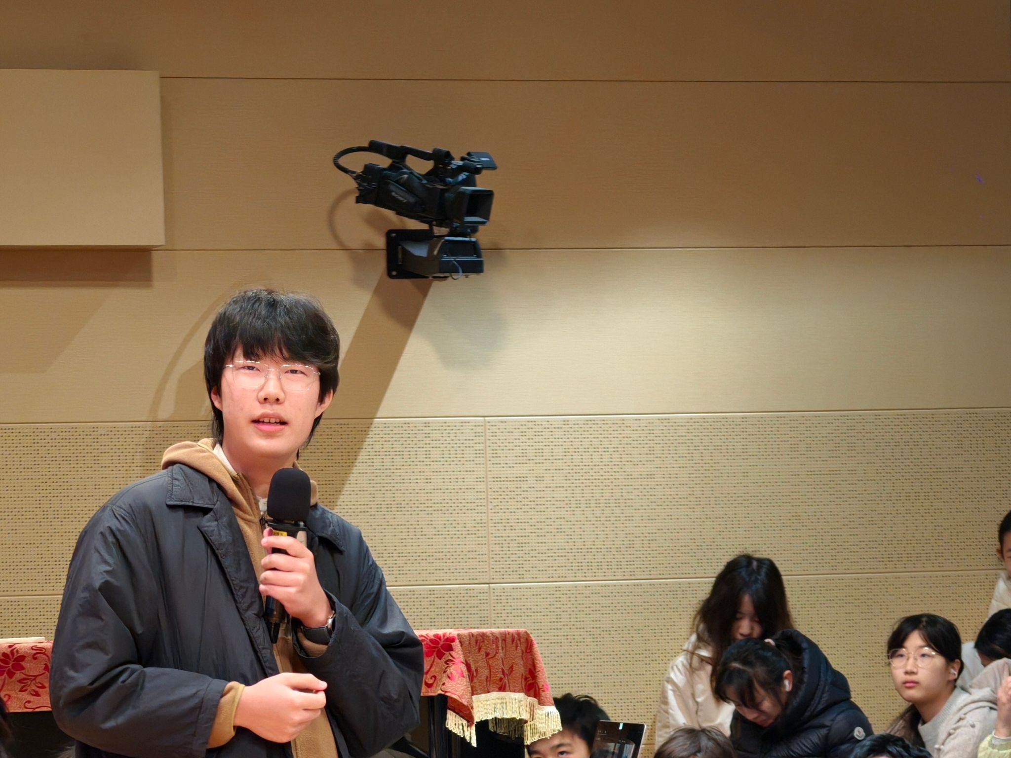 随后,来自9(10)班的陈同学分享了他在摄影方面的探索与心得。他从设备选用、参数调整和构图技巧等多个方面,详细介绍了摄影的入门与进阶知识。陈同学特别强调了“热爱”的驱动力量,鼓励所有对摄影感兴趣的同学们保持热情、持续创作。他还现场播放了一段由个人摄影作品剪辑而成的短片,精美的画面与动人的叙事赢得了全场热烈反响,进一步激发了大家对摄影艺术的兴趣。