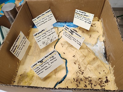 在课堂工作日那天,教室变成了制作工坊。同学们带来了所需要的各种材料,一边是搜集的历史资料,一边是纸板、泡沫、太空沙、乐高、彩泥、彩笔等工具材料。他们或专注于手上的制作,或与同学交流,修改调整自己的草图。一件件模型,一张张海报逐渐成型,每一件作品都蕴含着他们对古埃及文明的理解和思考。