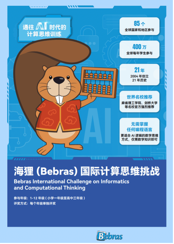 海狸(Bebras)国际计算思维挑战由国际信息学奥林匹克前主席(International Olympiad in Informatics,缩写:IOI)、维尔纽斯大学数学与信息学研究所教授Prof. Dr. (HP) Valentina Dagienė于2004年创立,它是一项面向全球青少年的计算思维与信息学教育活动,旨在通过趣味性的题目激发学生对计算机科学的兴趣,在不需要掌握任何编程语言的前提下,培养他们用计算机和逻辑思维去解决问题的能力,是一项辅助学校AI教育的优质活动。