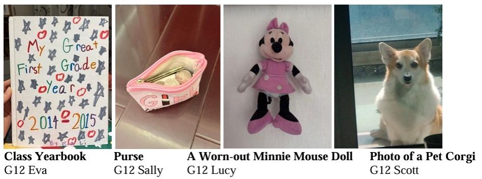 在个人层面,物件指向个体的情感世界与自我经验,如儿时珍藏的专辑、日记本、读不懂的《史记》,以及老旧的米妮娃娃与熊猫背心;在家庭层面,物品嵌入亲密关系之中,包括乐高赛车、用到现在的小勺、爷爷的象棋、陪伴成长的宠物柯基、零钱包,以及已经坏了的 CD 播放器;在学校与社区层面,物件则连接着同伴互动与集体记忆,如剑道训练的木剑、小伙伴们留下的纸条、一年级纪念册,以及《熊出没》第一集的截图与评论。