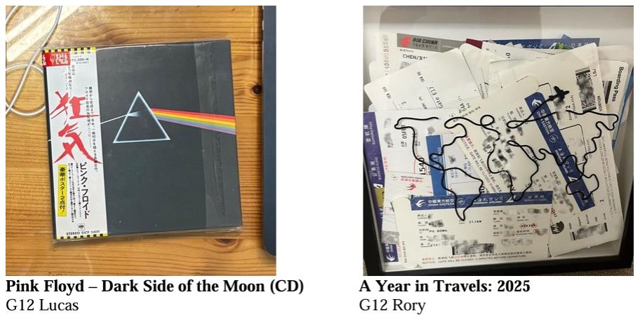 作为第一学期课程的重要实践活动,1月9日中午,G12社会学两个班级共同策划并呈现了一场联合“快闪”展览。学生以一件属于自己的物品为起点,将个人记忆、情感与社会学视角结合,在近一个月的时间内策划出一场关于身份、记忆与价值的迷你展览。物品不再只是日常用品,而成为理解社会与自我的窗口。