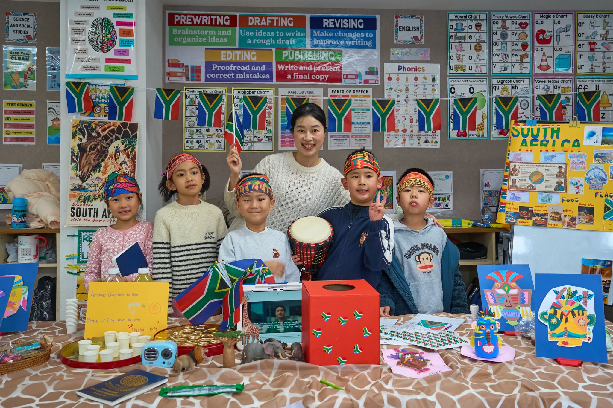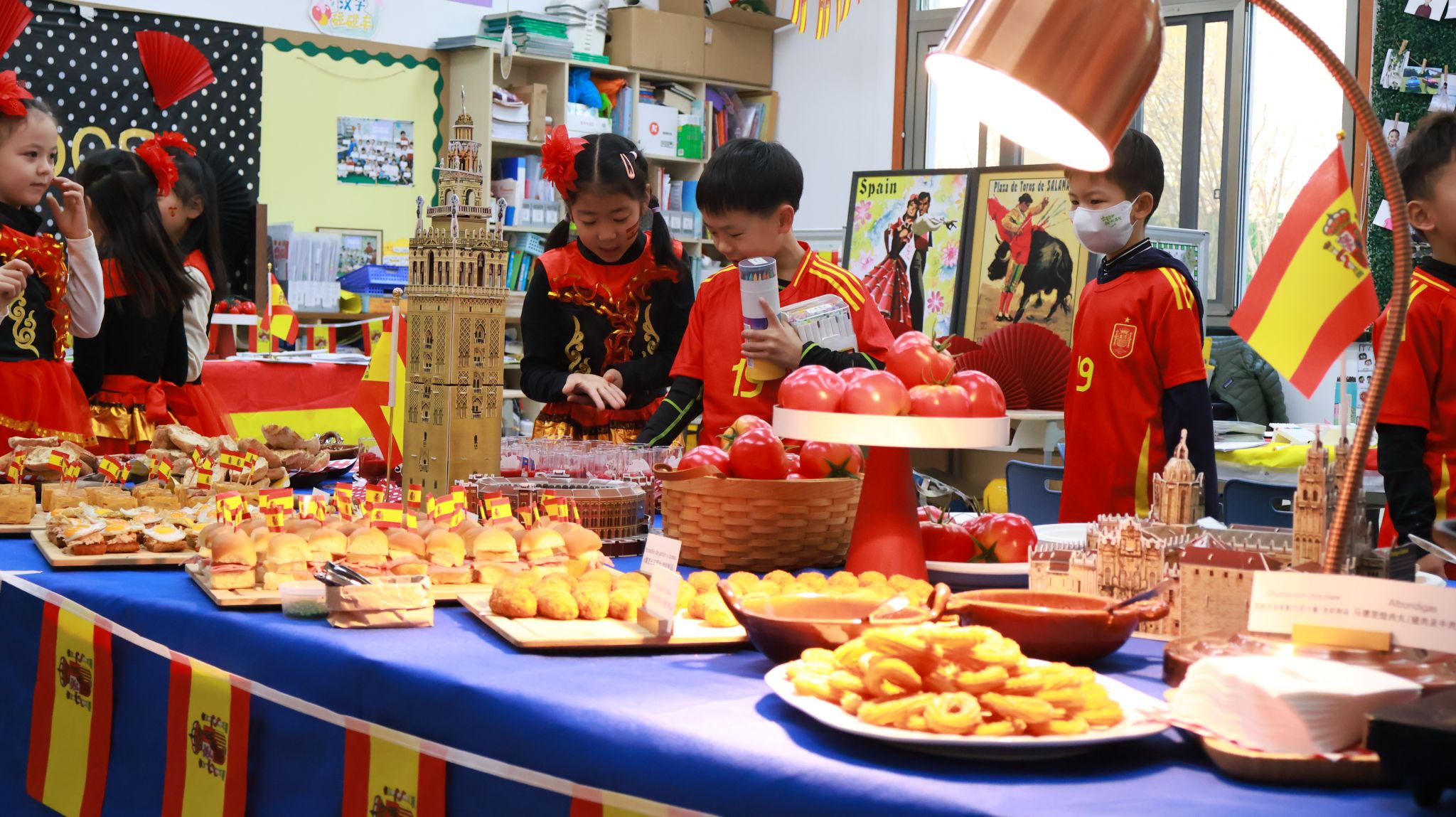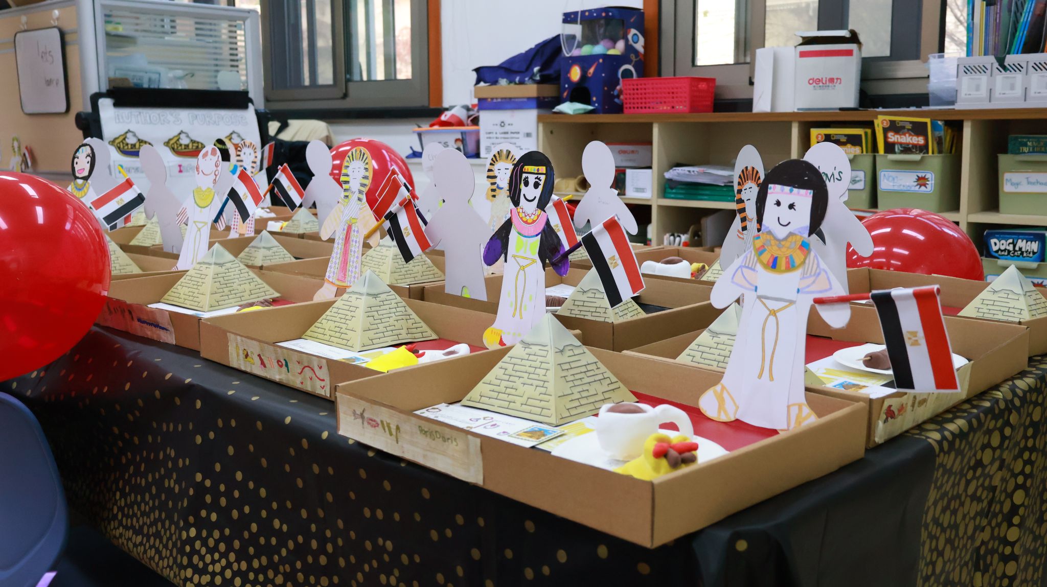 在浦西校区,一年级学生们穿梭于走廊,走进由各班精心打造的“国家主题馆”。墙上装饰着孩子们前几周在课堂上完成的作品,包括各国国旗及文化符号。欧洲展区涵盖了爱尔兰、西班牙、威尔士、葡萄牙和希腊;在非洲展区,埃及的布置格外醒目;北美展区则以加拿大和墨西哥压轴,展现浓郁地域风情。