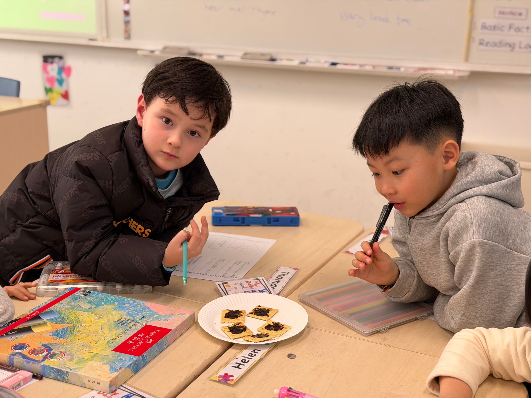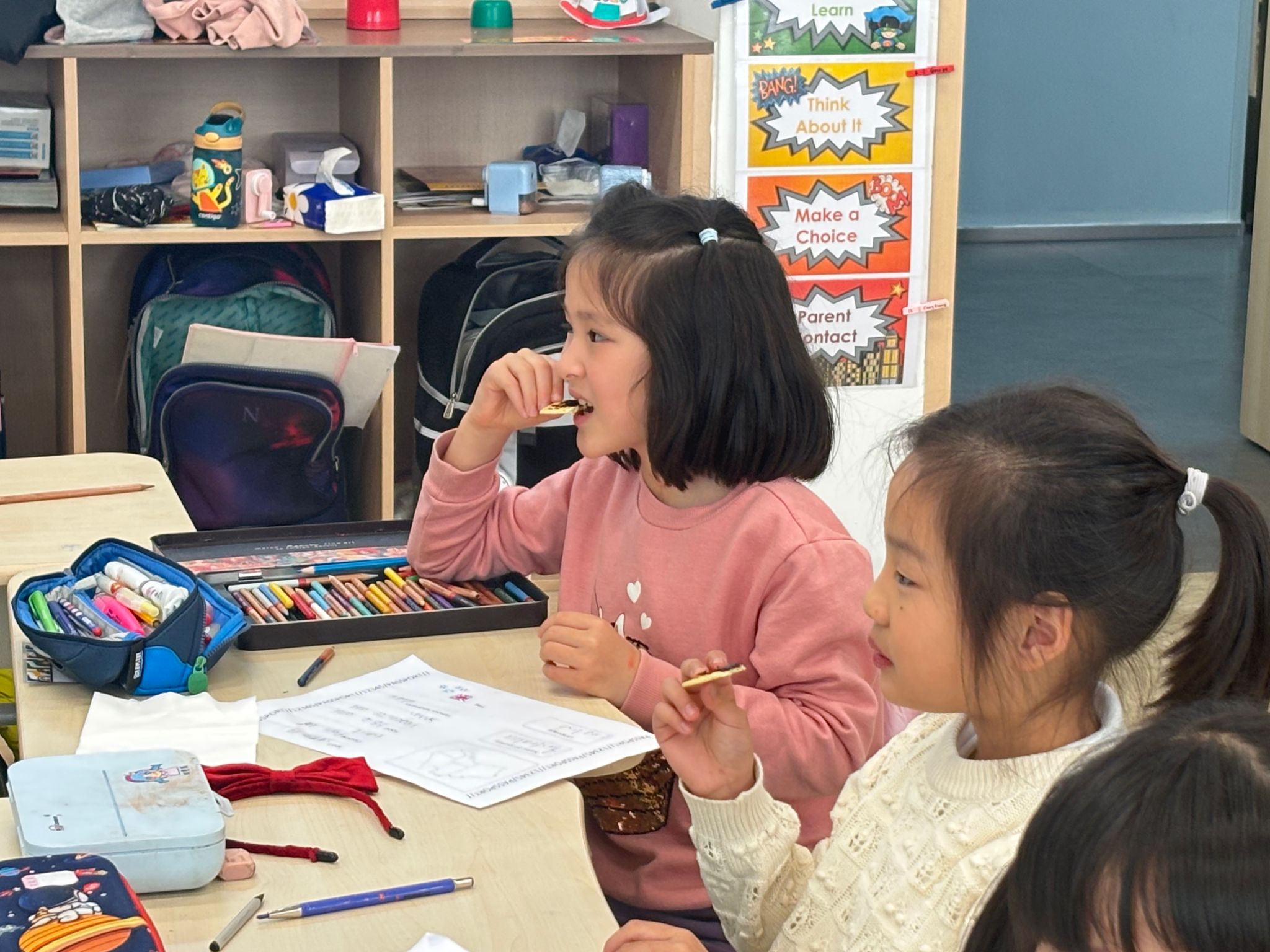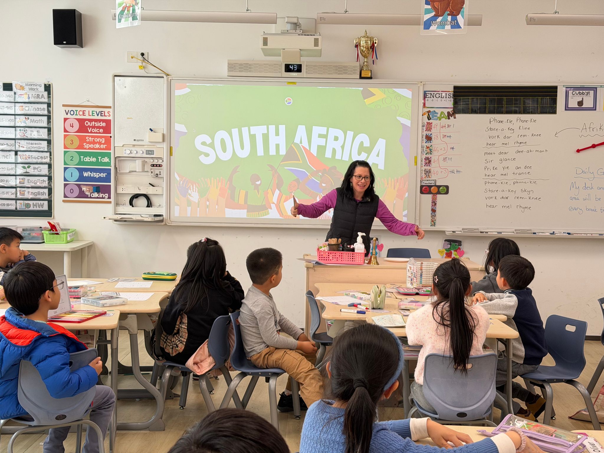在浦西校区,一年级学生们穿梭于走廊,走进由各班精心打造的“国家主题馆”。墙上装饰着孩子们前几周在课堂上完成的作品,包括各国国旗及文化符号。欧洲展区涵盖了爱尔兰、西班牙、威尔士、葡萄牙和希腊;在非洲展区,埃及的布置格外醒目;北美展区则以加拿大和墨西哥压轴,展现浓郁地域风情。
