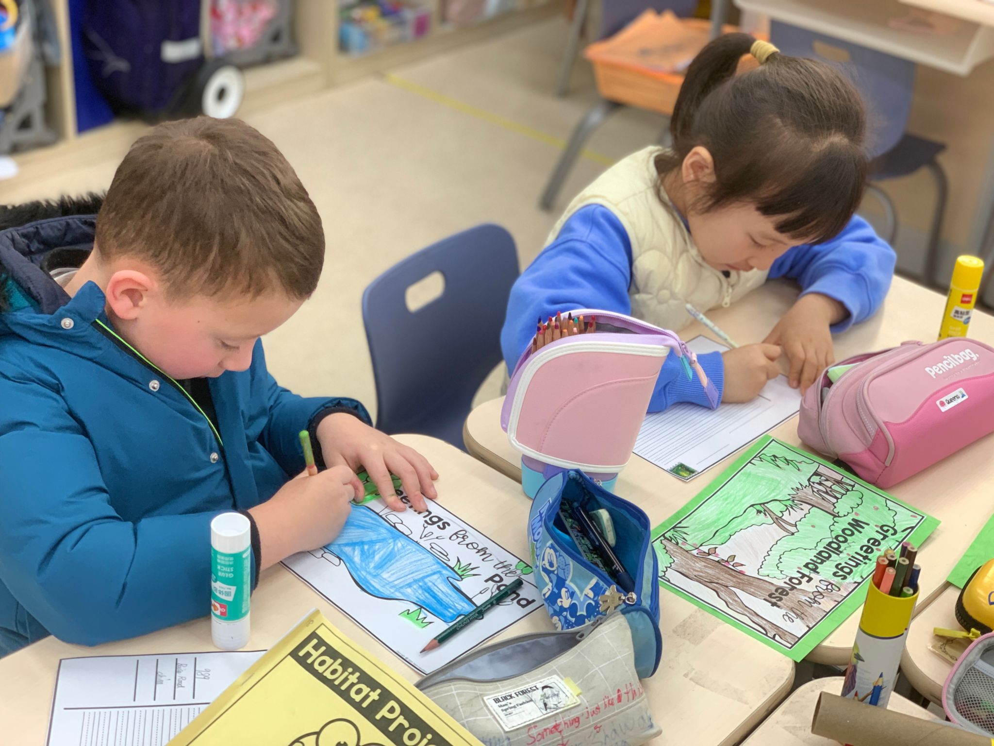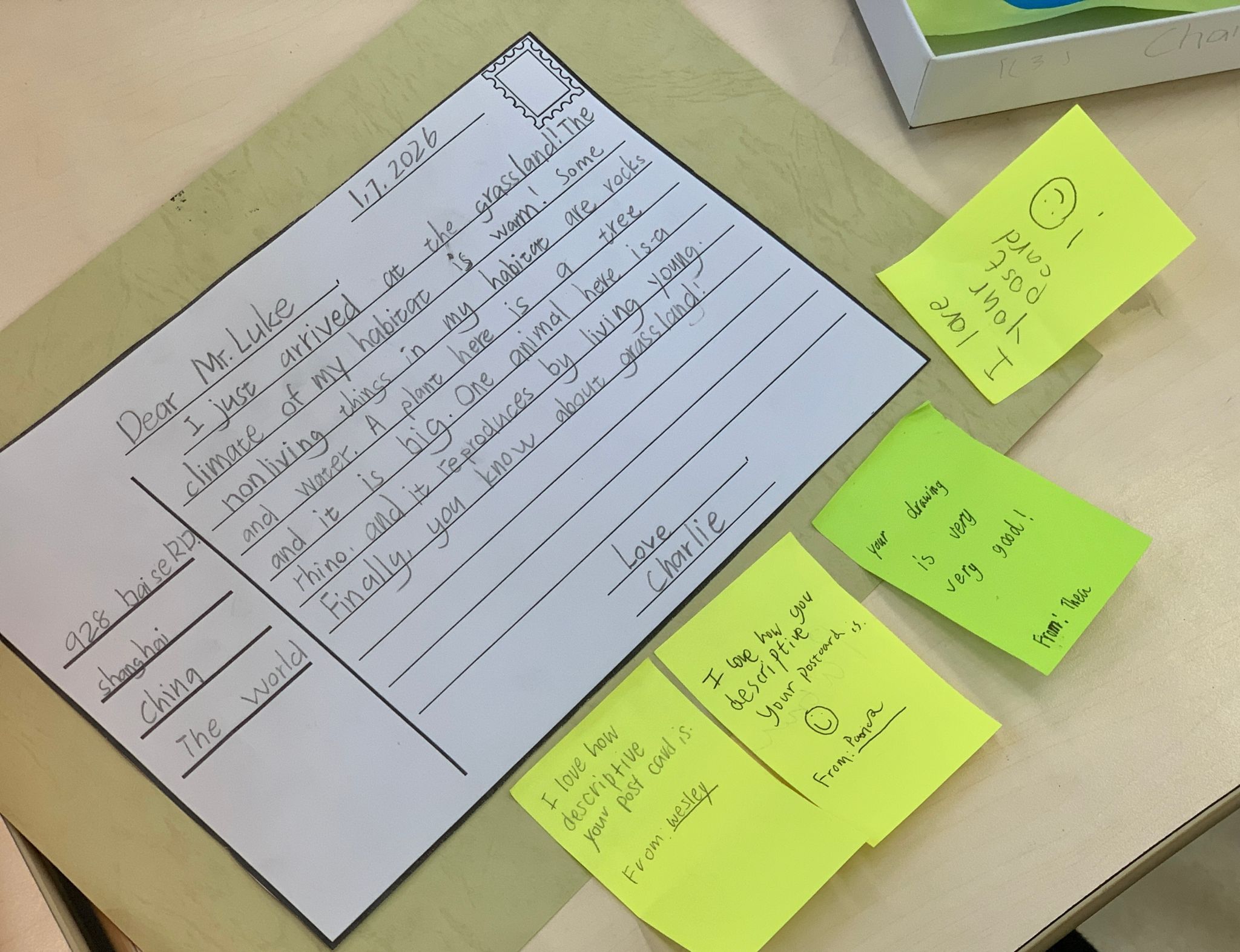 为了配合模型制作,学生们还撰写英文明信片介绍自己的栖息地,学习用清晰准确的语言描述环境特征。写作不仅锻炼了表达能力,也为接下来的口头展示理清了思路。