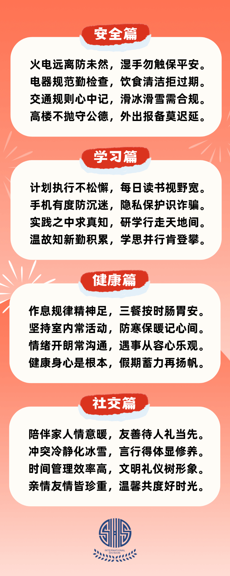 寒假已经开始,新春佳节也将临近。在享受快乐假日、温暖团聚的同时,也别忘了将安全与健康常记心间。请查收来自SHSID的温馨提示。