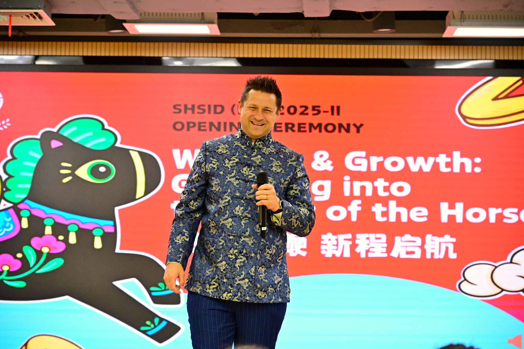 典礼在Mr. Samuel热情洋溢的主持中拉开序幕。他亲切地欢迎全体师生返校,并特别向本学期新加入虹口校区的两位同学表示热烈欢迎。他以马年奔腾不息的精神为引,鼓励同学们在新的学期里充满活力、追求卓越,现场气氛在温暖的问候中迅速升温。