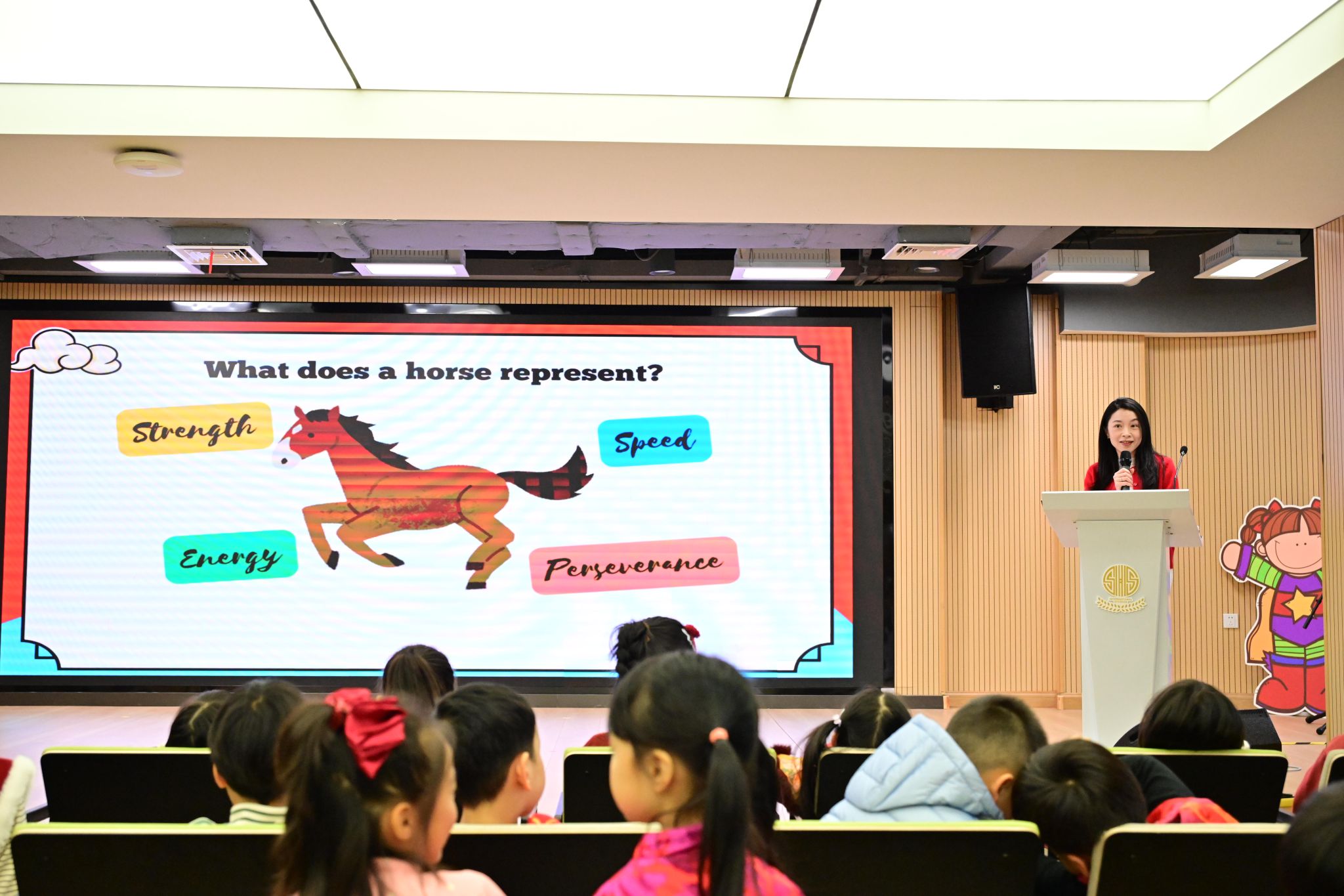 国际部虹口校区主任朱丹老师登台致辞。她以马年的精神为引,勉励全体学生如骏马般不畏前路、勇敢前行。她回顾了上一学期大家的成长:一年级同学更加独立有秩序,二年级同学展现出了责任与团队精神,三年级同学则以领导力成为学弟学妹的榜样。随后,她向每位同学介绍了新学期礼物——“小马挂件”,寓意面对困难时勇敢奔驰、遭遇挑战时坚韧不拔、追求目标时脚踏实地。她对新学期提出三点期望:增长智慧(善用“yet”的力量)、增长品格(诚实、尊重、友善)、增长勇气(勇于尝试与挑战)。最后,她号召全体师生策马扬鞭、新程启航,携手迈向充满智慧与成长的新学期。