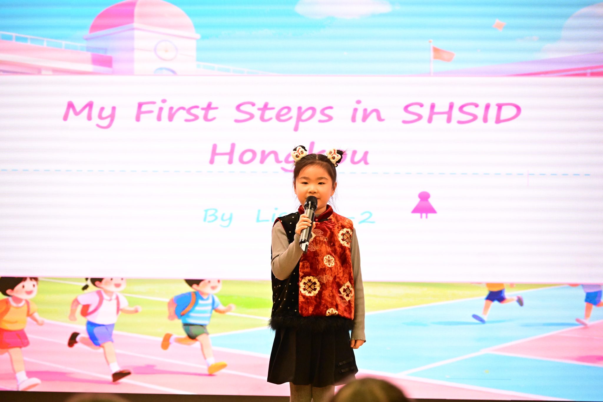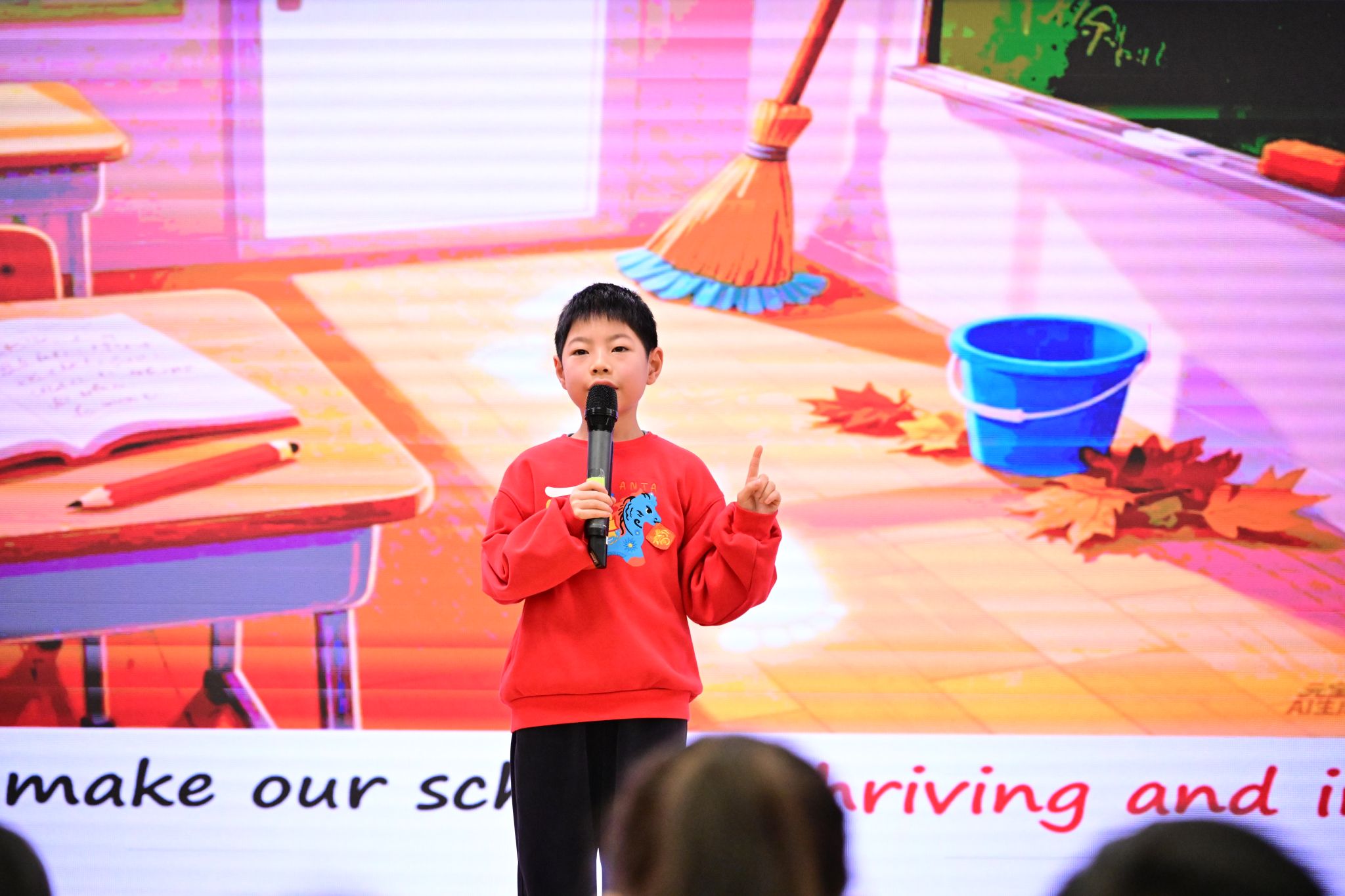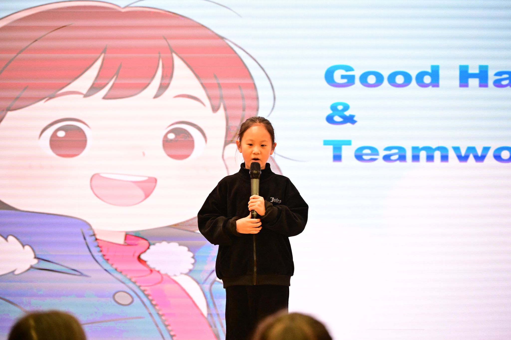 在“策马扬鞭”分享环节,三位学生代表依次登台,讲述各自的成长故事。1-2班的Lisa首先分享了她初入虹口校区的兴奋与发现,并以参与“marble party”的经历为例,讲述了全班共同努力赢得荣誉的喜悦,稚嫩而真诚的话语中满是对新学期的憧憬。2-1班的Jacquelyn围绕“好习惯与团队协作”展开分享,讲述了如何通过坚持先完成作业再玩耍的好习惯提升成绩,并在“Mini Market”中与伙伴合作,成功售罄手工制品,展现出团队合作的巨大力量。3-2班的William则以“责任与榜样”为题,分享了他从一次数学测验中吸取教训、开始自主检查作业和制定学习计划的经历,并讲述了作为“Energy Monitor”以身作则带动同学节约能源的故事,深刻诠释了三年级学生的责任担当与领导力。