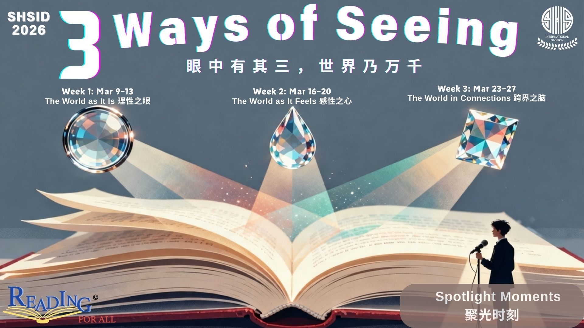 阅读,从来不只是翻过多少页书,记下多少行字。它是我们看向世界的另一双眼睛。今年春天,我们邀请每一位学生,戴上三副不同的“透镜”,重新打量这个熟悉又陌生的世界: