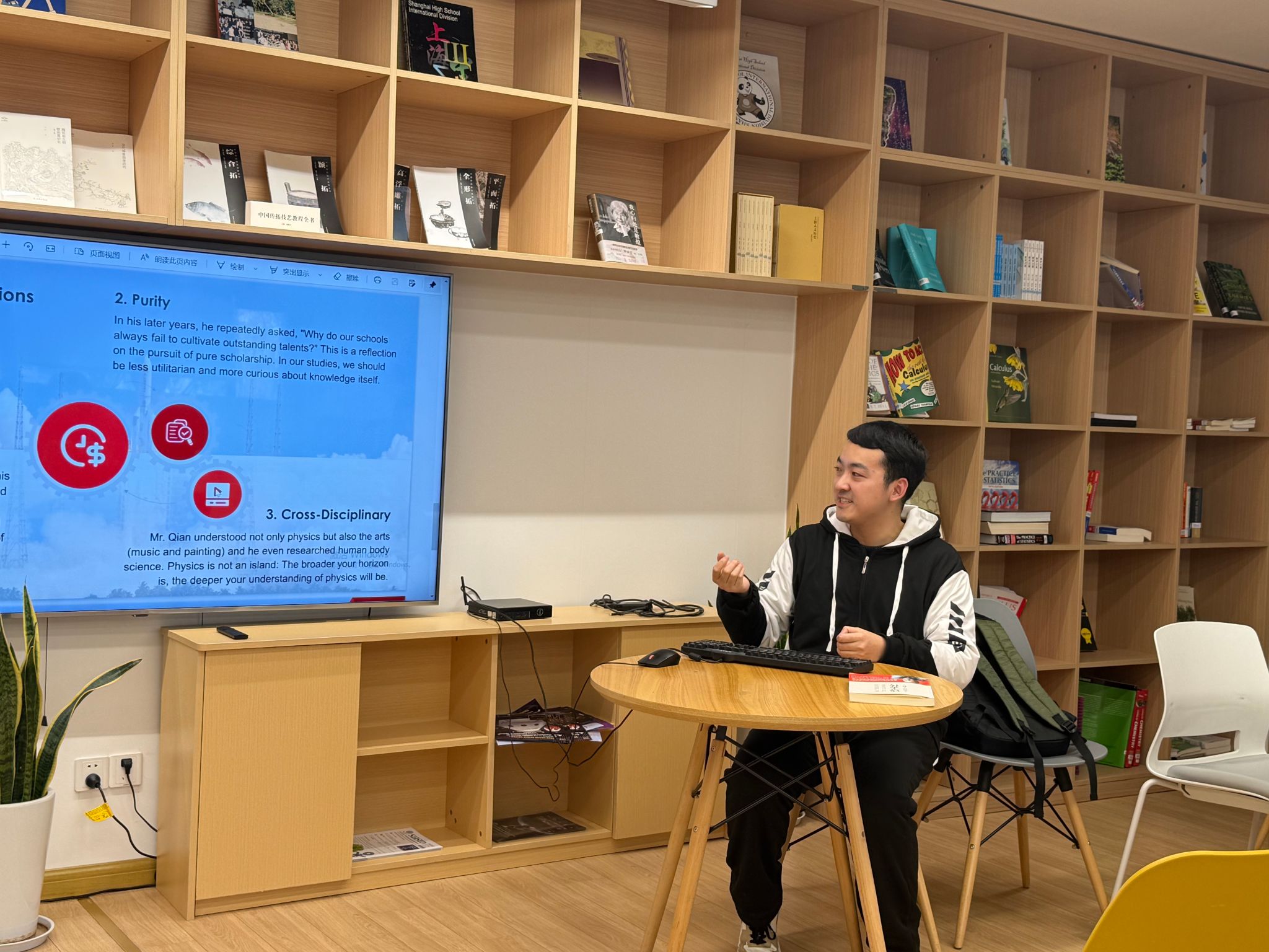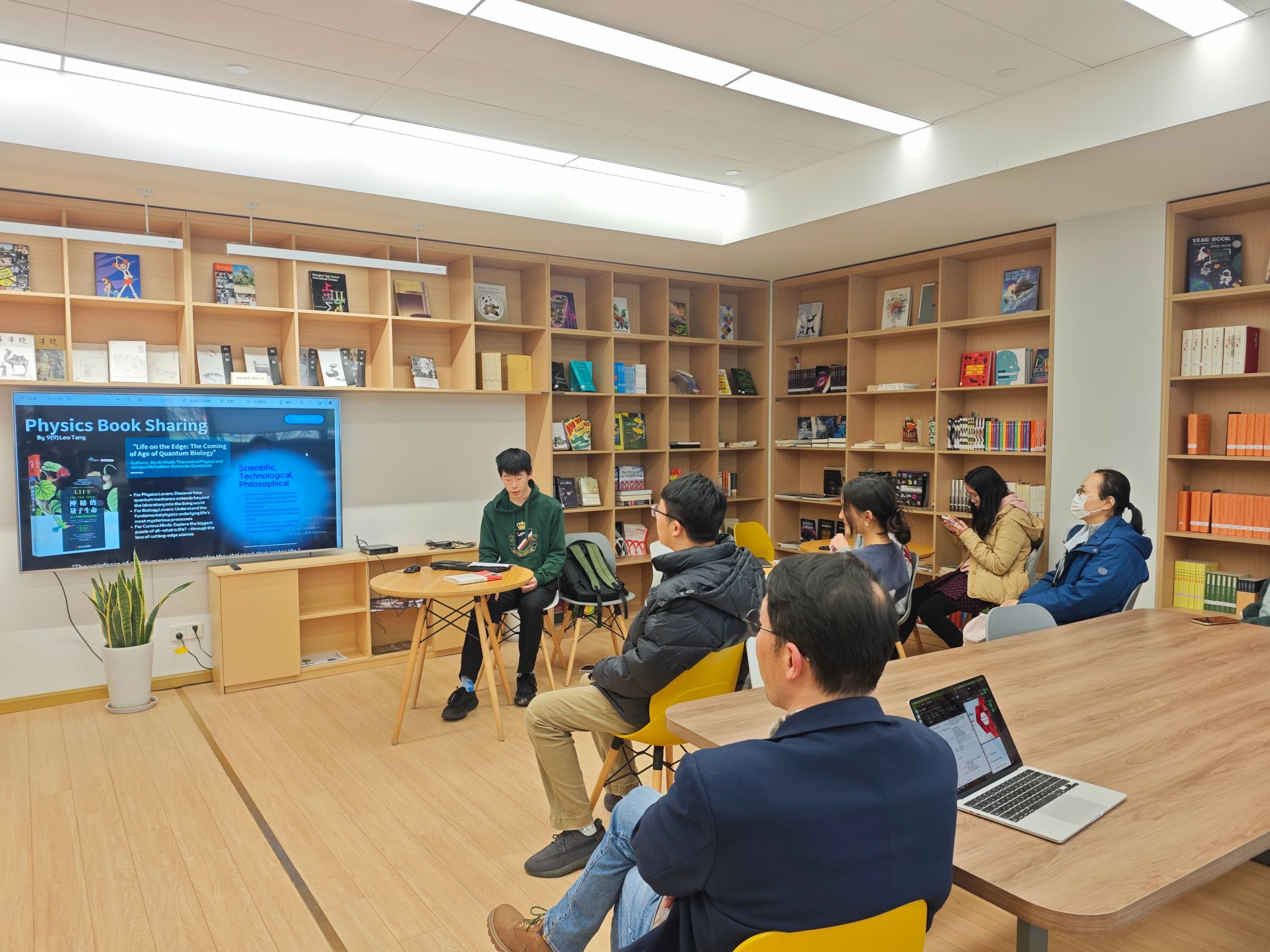 3月13日中午,师生们在中兴楼阅览室相聚,进行一场别开生面的书籍分享会。物理组的李宇晨老师分享了《蚕丝——钱学森传》的阅读感悟,他以细腻的语言还原了钱学森青年时代的求学经历、归国之路的波折,以及他在中国航天事业中的开创性贡献。一个科学家的坚持、选择与担当,在他的分享中被赋予了温度,让在场师生无不为之动容。来自9(9)班的Leo Tang同学则带来《神秘的量子生命》一书的阅读分享。他从量子生物学的角度切入,讲述了量子效应如何可能影响鸟类迁徙、光合作用乃至人类的嗅觉感知,他将原本抽象深奥的物理概念与自然生命紧密相连,激发了同学们对跨学科思维的兴趣。现场听众时而凝神倾听,时而踊跃提问,思想的涟漪在安静的阅览室中悄然扩散。
