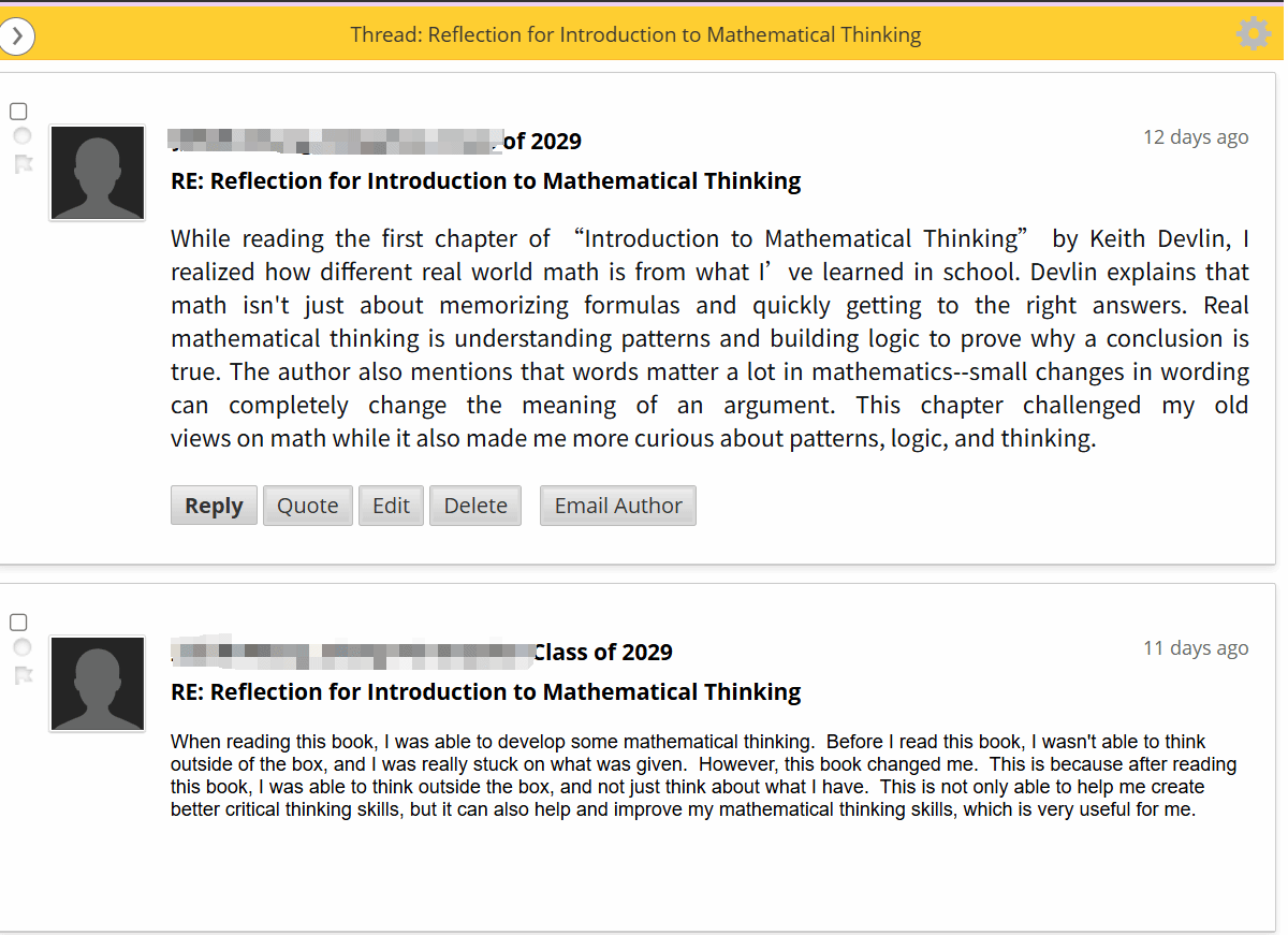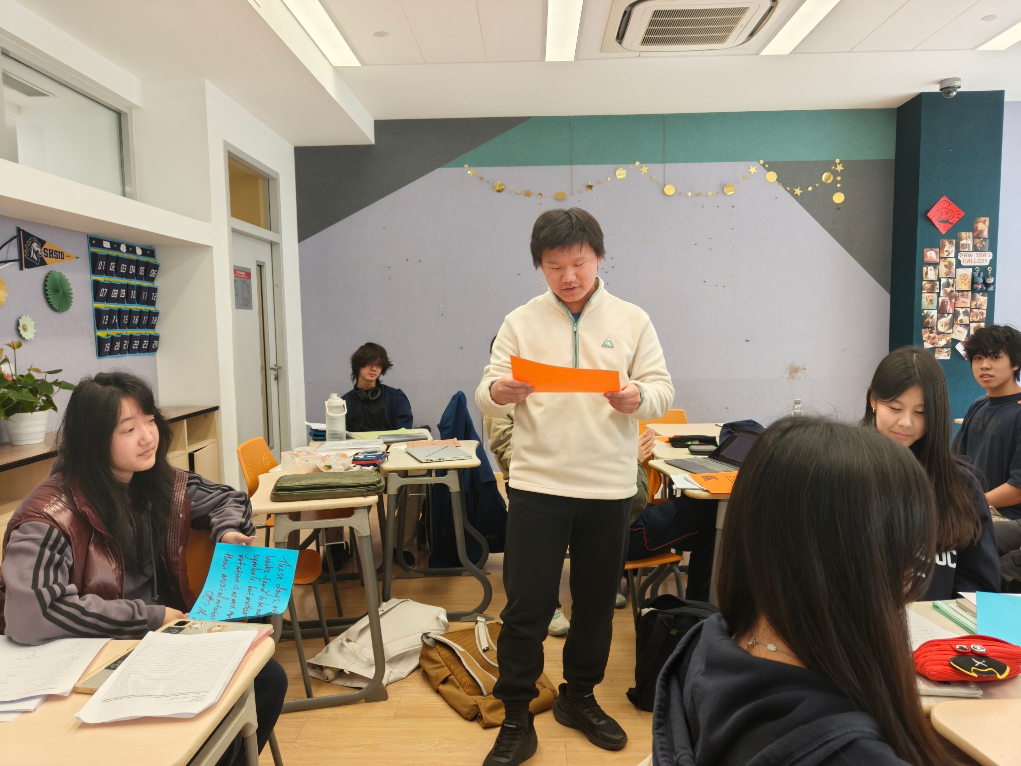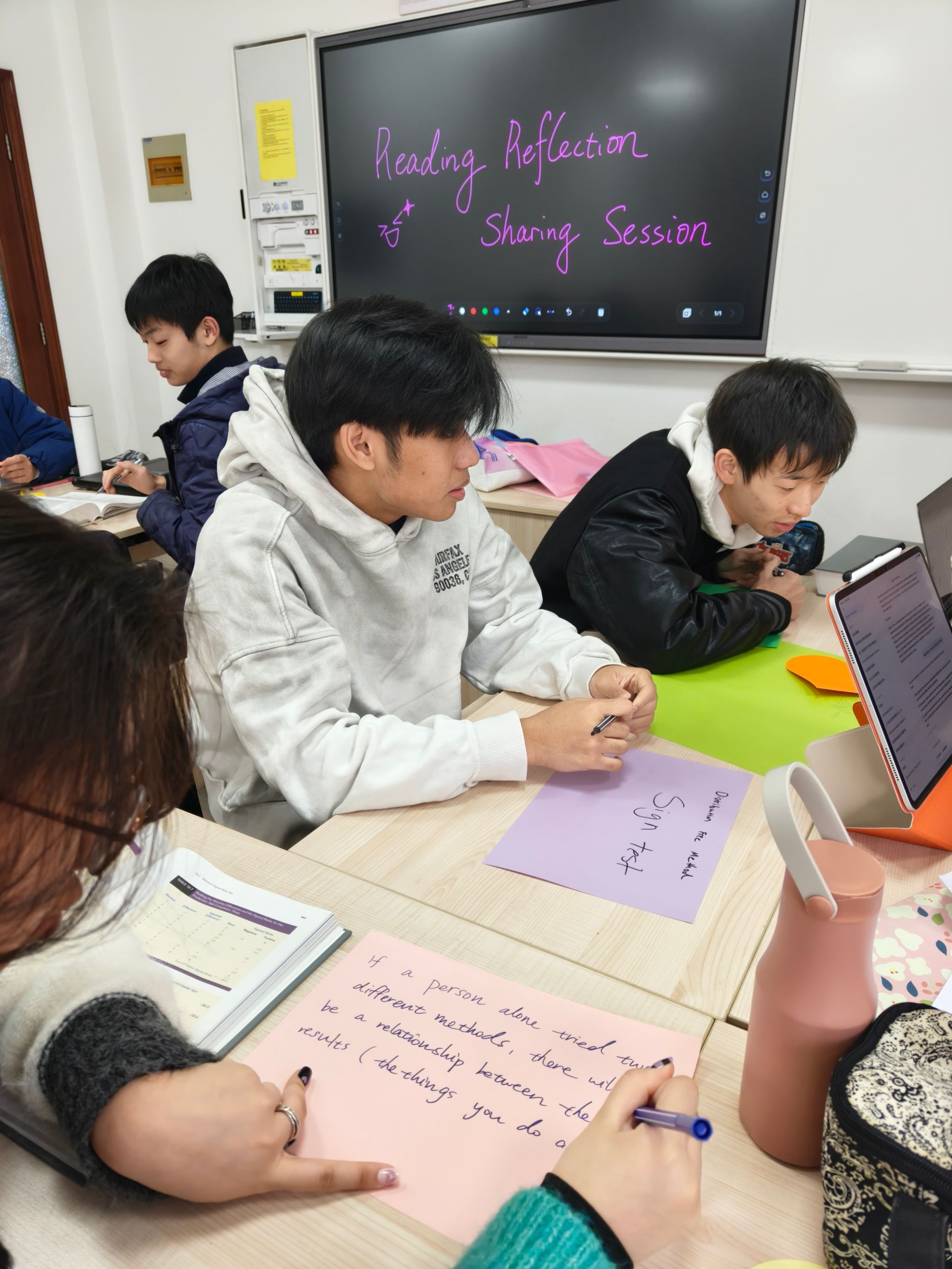 各年级数学教学班也在这两周于课堂内积极开展了阅读分享活动,将“理性之眼”的视角延伸至日常教学的点滴之中。老师们结合课程特点,为学生推荐适合的阅读资料,并以丰富多样的形式鼓励每一位学生主动阅读、记录所思所感。有的班级在线上平台的讨论版交流观点,碰撞思维火花;有的班级合作制作海报,用图文呈现数学之美;还有的班级在洒满阳光的教室里围坐一圈,声情并茂地朗读自己的阅读金句……有学生感慨道:“History is not a line but a branch of probabilities.”(历史不是一条直线,而是一枝概率的分岔。)学生们徜徉的不仅是数学知识的海洋,更从数学这扇独特的透镜中重新打量世界——数学不仅是一门学科,更是一种理解世界的思维方式。在这过程中,每一位学生都在课堂上拥有了属于自己的发言时刻,让阅读的收获从个体走向集体,从沉默走向表达。