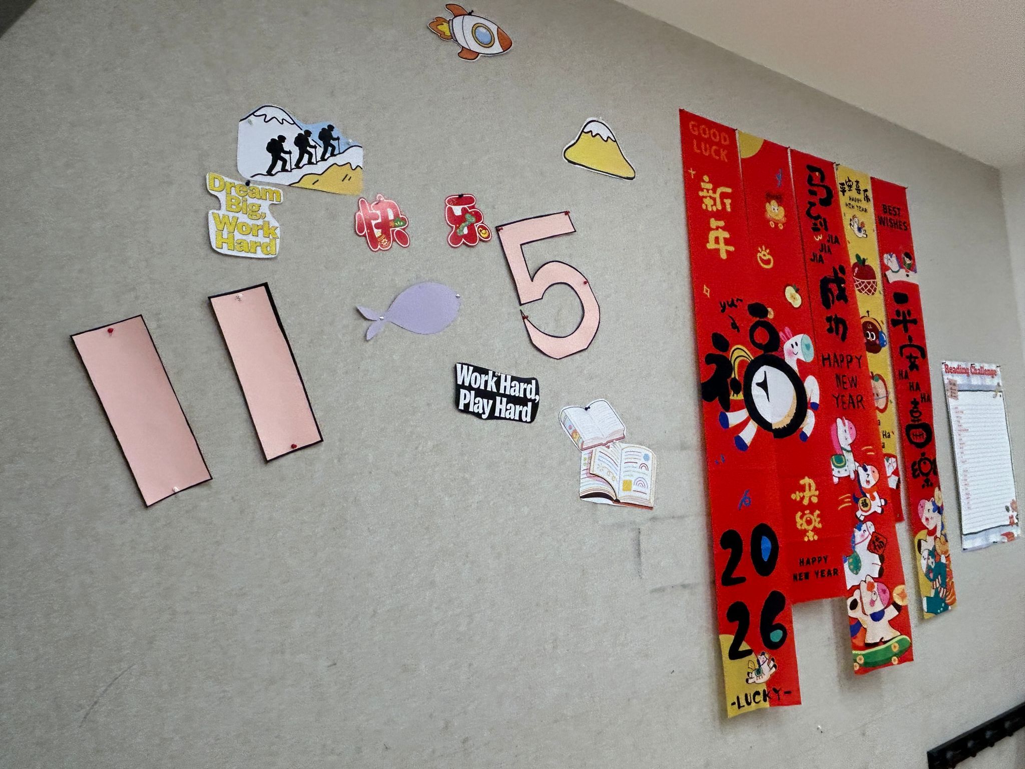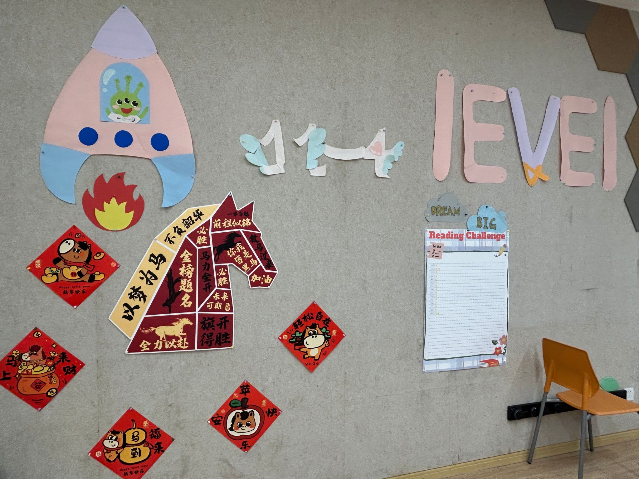 有的教室贴着象征着马年的五马奔腾图案,马的身体上别具一格地划分成了许多区域,每个格子里都写着同学们新学期的愿望和期许。还有的教室里贴了许多小花,每片花瓣上都写着他们对未来的心愿和报复。更有采用色彩碰撞风格的设计,展现出富有生命力、鲜活饱满的精神状态和满满的干劲。
