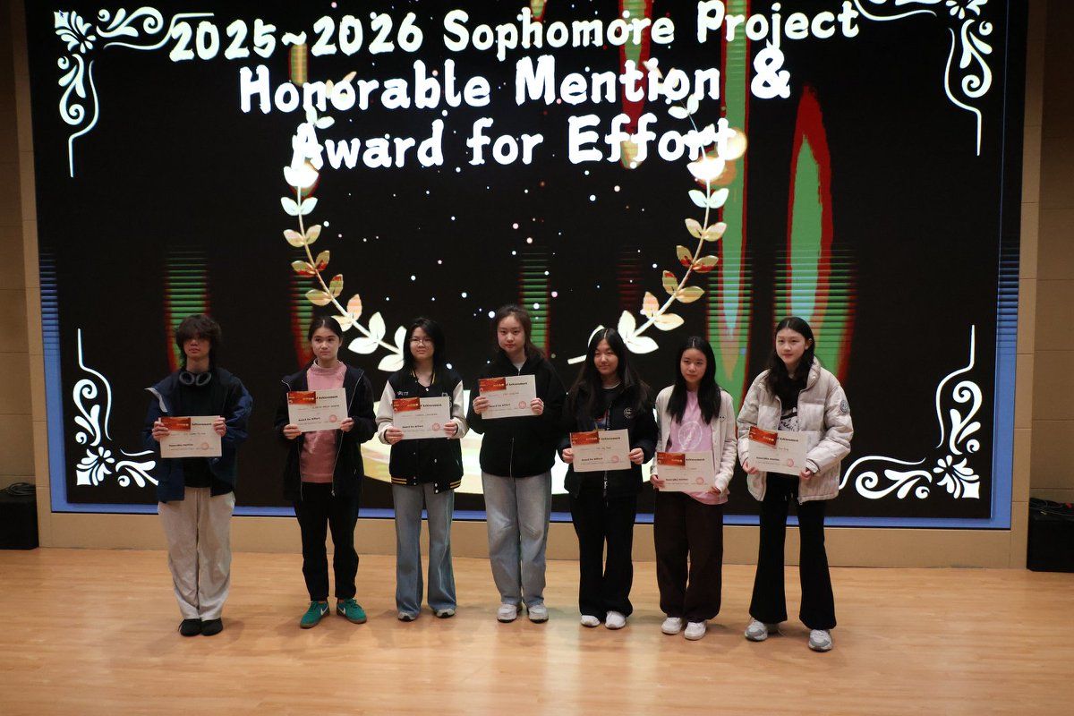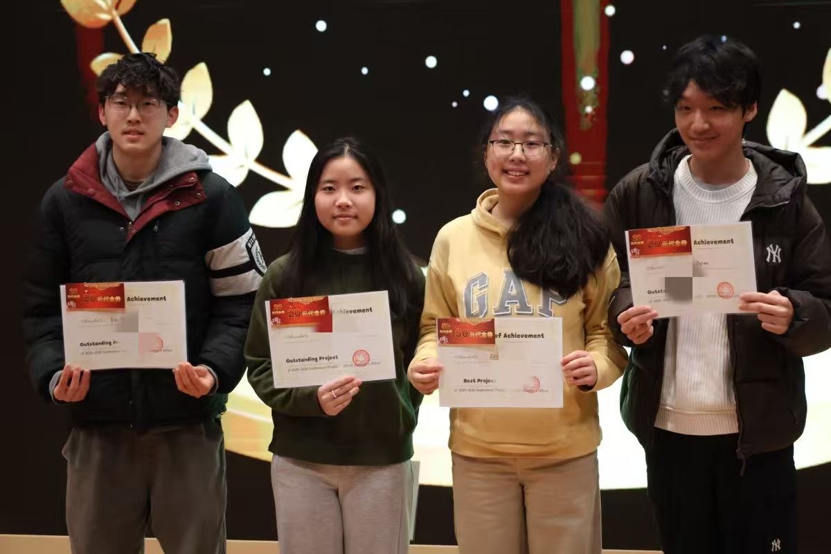 在首先进行的十年级专题项目颁奖环节中,年级组对完成专题项目表现优异的学生进行了表彰, 充分肯定了同学们的付出与创新。获奖学生依次上台领取证书,现场气氛庄重而热烈。随后,漫音社进行了社团宣传。社团成员回顾了在2025年运动会义卖等活动中的成果,并介绍了即将在四月初举办的春季义卖计划,届时将推出全新设计的原创制品。此外,漫音社还面向全年级发起乐队成员招募,欢迎有组建乐队意愿的同学加入。