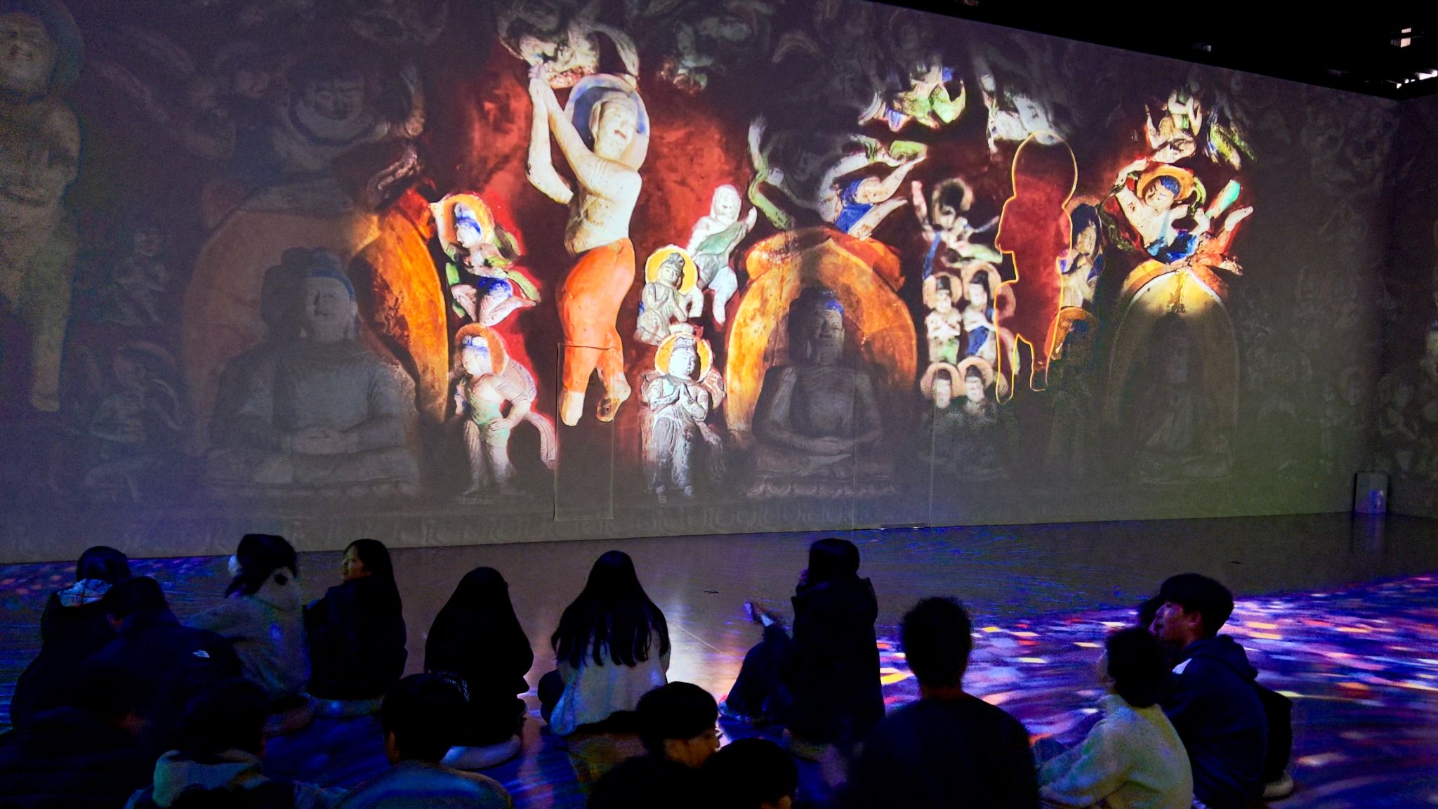 绘画展区里,云冈飞天、力士的经典形象以当代艺术形式呈现;光影体验区作为本次特展的特色板块,以4K全景光影技术搭配激光雕刻展演,将云冈石窟千百年的历史脉络、精美纹样全方位“活化”呈现。传统光学原理与现代数字投影技术的巧妙融合,让静态的石窟造像拥有了动态的生命力,学生们仿佛穿越1500年悠悠时光,身临其境地置身于北魏时期的石窟现场,大家一边沉浸式观赏,一边认真在研学手册中记录下背后的历史知识与科学原理,在视觉震撼中实现学科知识的趣味交融。
