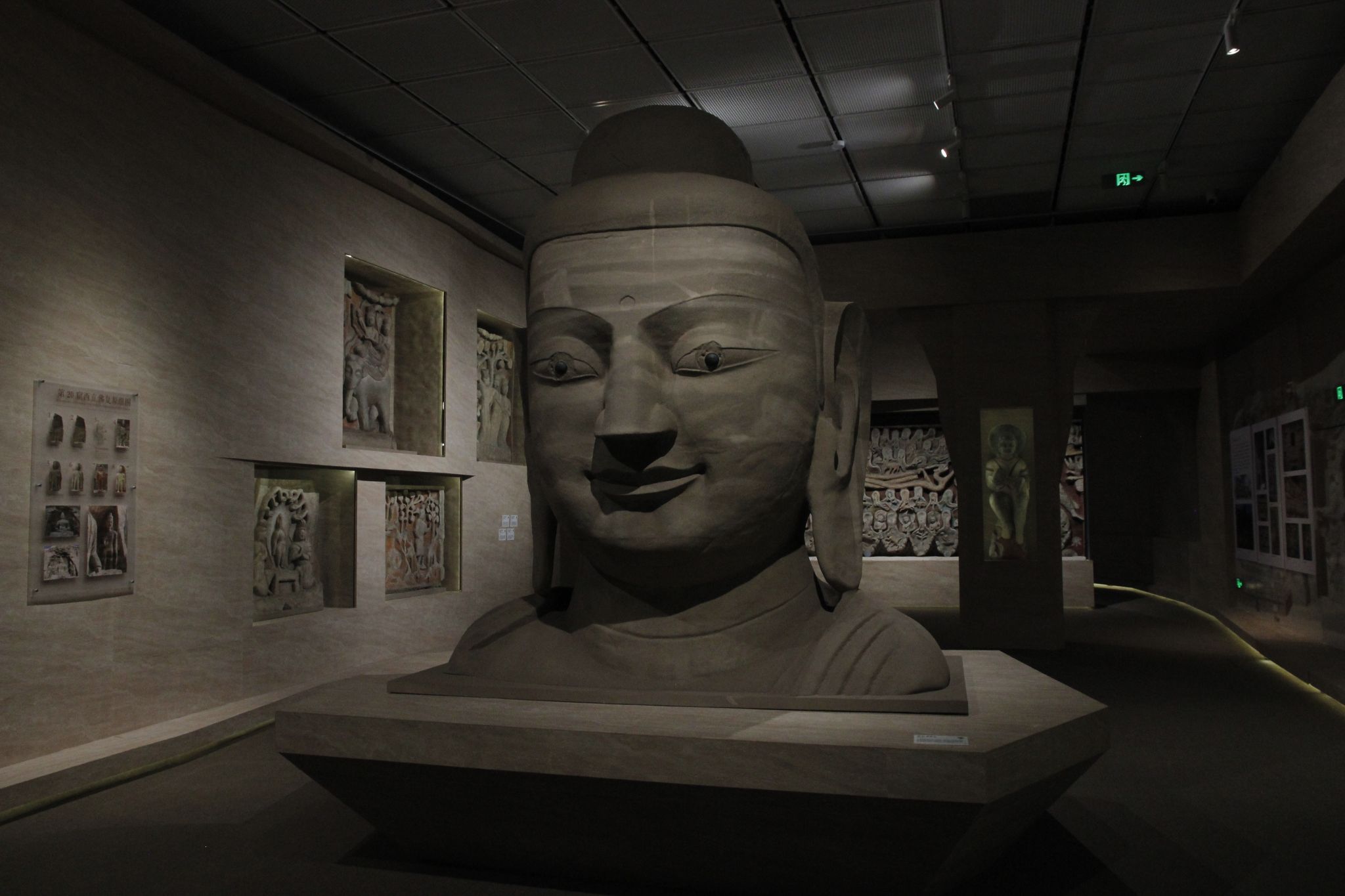 抵达特展现场,学生们首先走进今潮8弄的户外展区,打卡本次展览的核心亮点——云冈第12窟“音乐窟”1:1复刻洞窟。这一全球首例可移动3D打印复刻洞窟,以毫米级精度还原了石窟的岩石肌理与造像细节,内壁上手持琵琶、筚篥等中西乐器的伎乐天人栩栩如生。学生们驻足凝望石壁,聆听复原的北魏宫廷乐曲,沉浸式感受“中国最早的宫廷交响乐团”的艺术魅力,不少学生还对照研学手册,记录下洞窟的雕刻特色与音乐元素。随后,学生们移步趣看美术馆室内展区,开启第二站的深度探访。在展厅中,云冈石窟最具标志性的第20窟佛首静静陈列,庄严大气的造像让学生们惊叹不已,大家纷纷结合研学手册的词汇闯关任务,用“庄严”“精美”等中文词汇描述所见所感。