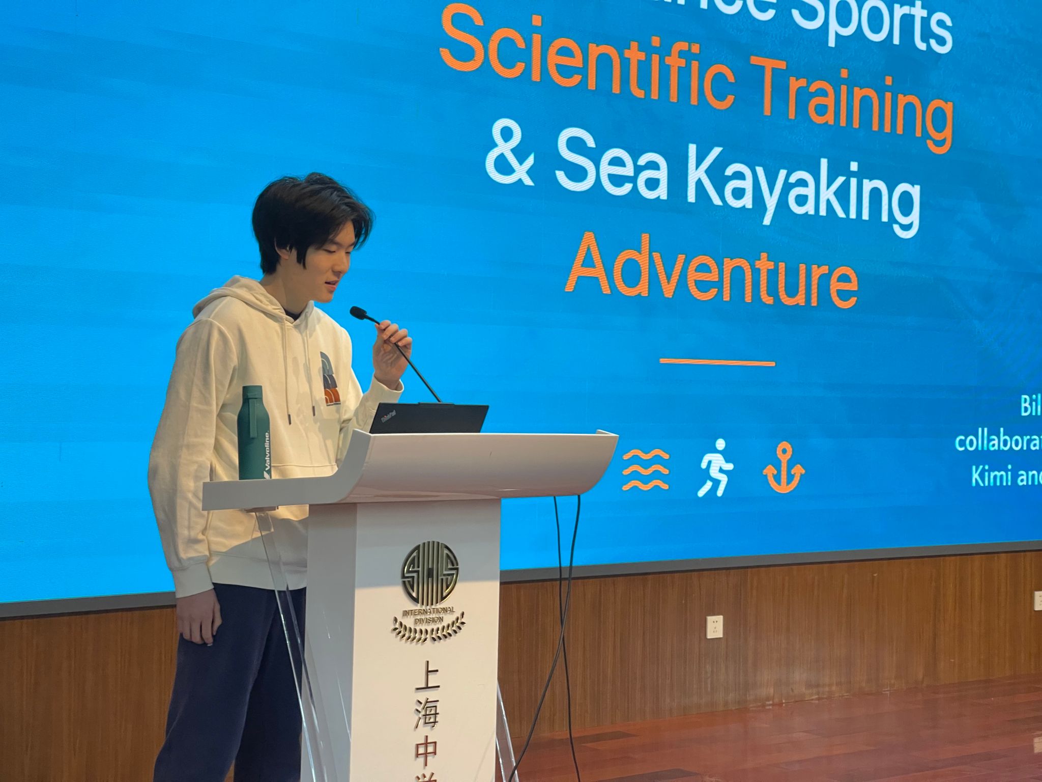 3月20日,国际部十二年级全体学生齐聚先棉堂辅楼礼堂,举行例行晨会。本周,12-6 班的蒋同学走上讲台,带来了一场以耐力运动、科学训练以及渤海海上皮划艇探险为主题的分享。