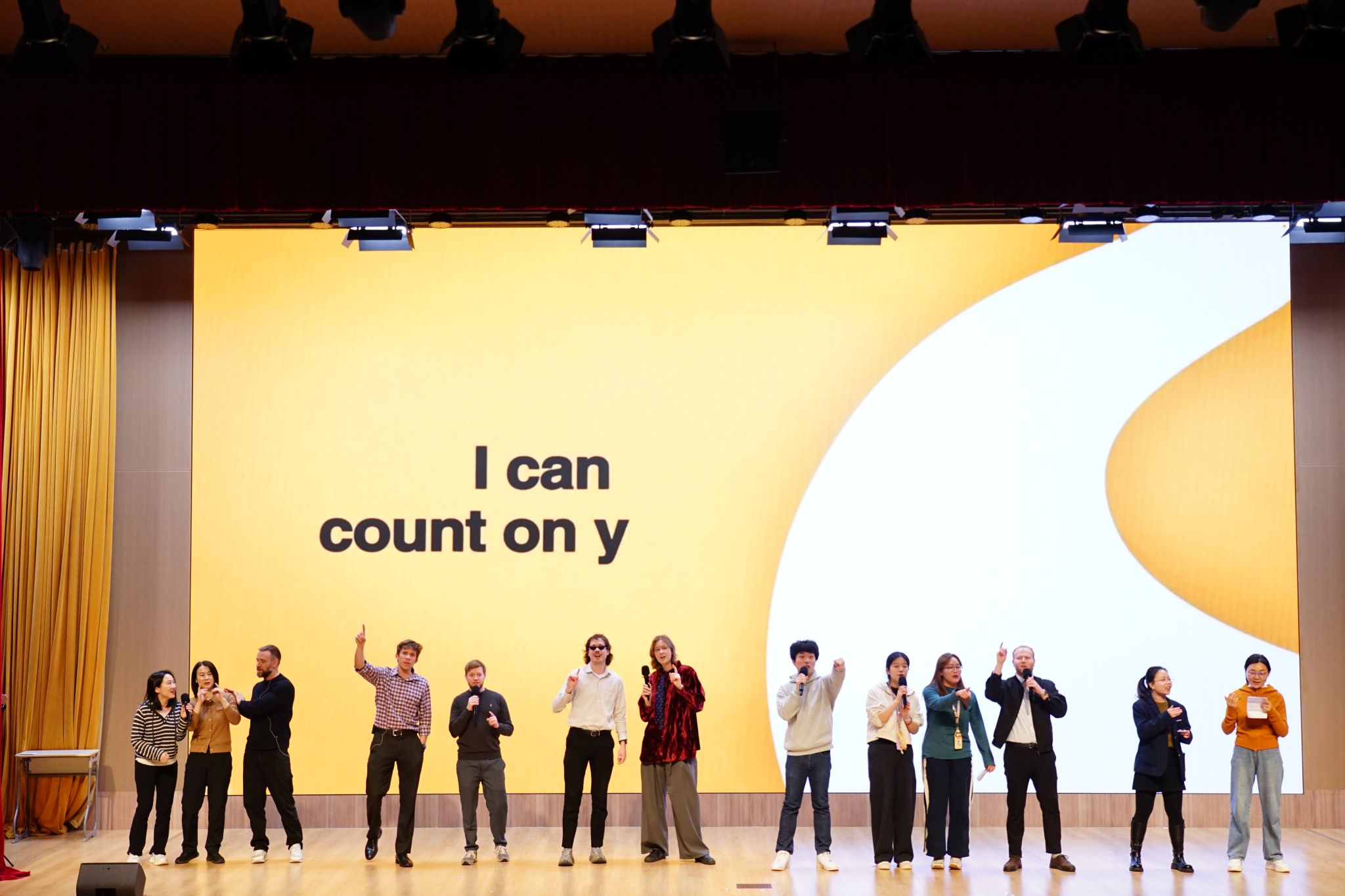 在热烈的氛围中,演出迎来了温馨而精彩的收官环节——教师表演。平日里严谨认真的中外教师们走上舞台,倾情演唱了一首《Count on Me》。悦耳的旋律、轻松的节奏与真挚的情感交织在一起,不仅点燃了现场气氛,也表达了老师对同学们一直的关爱和支持。