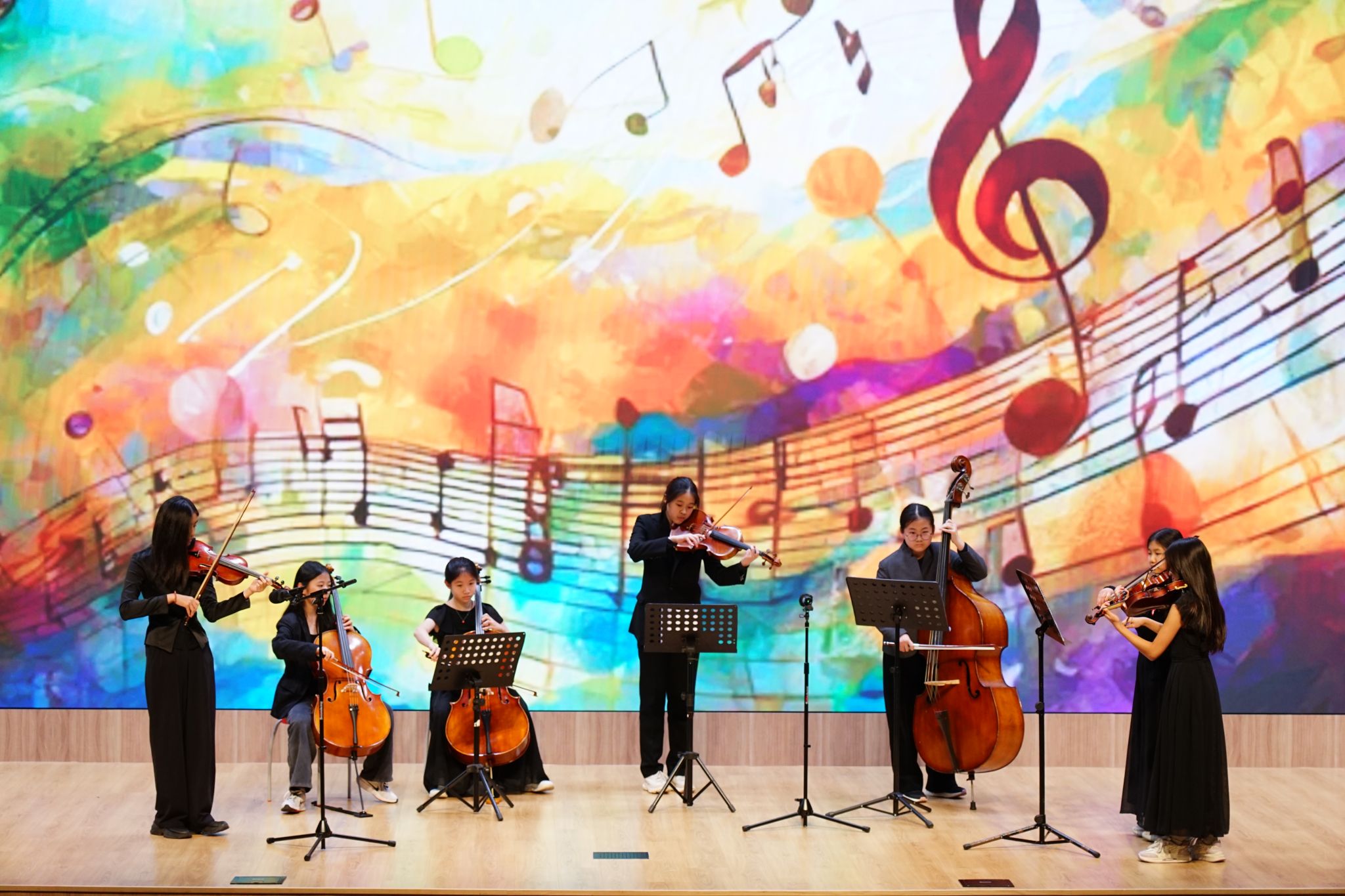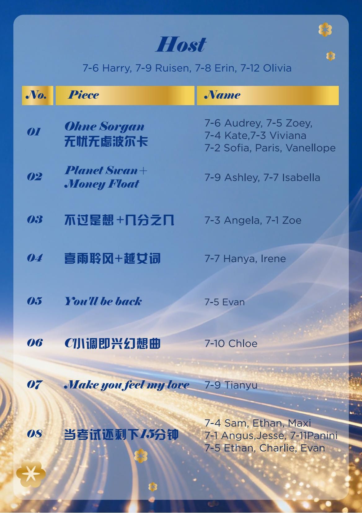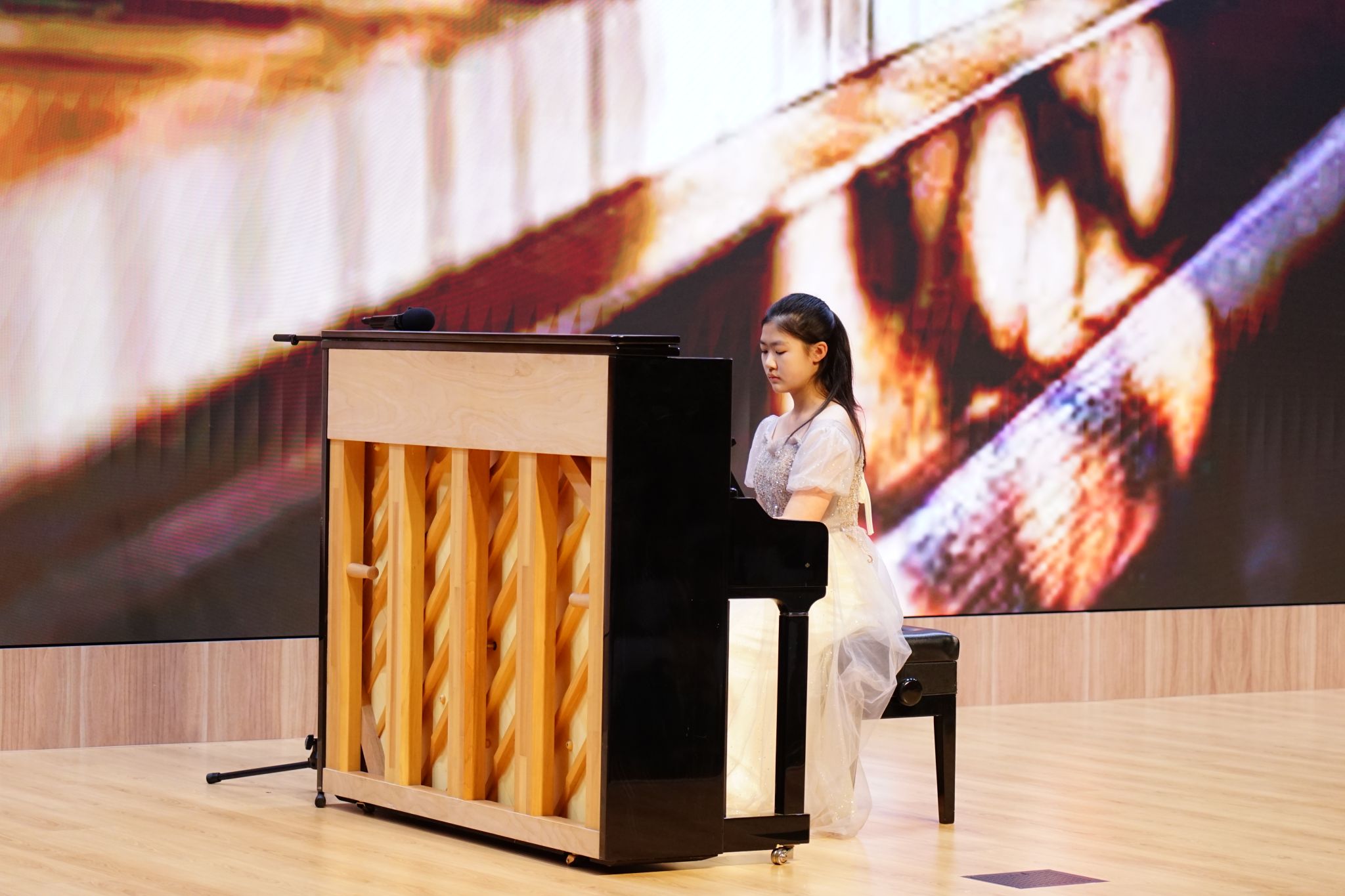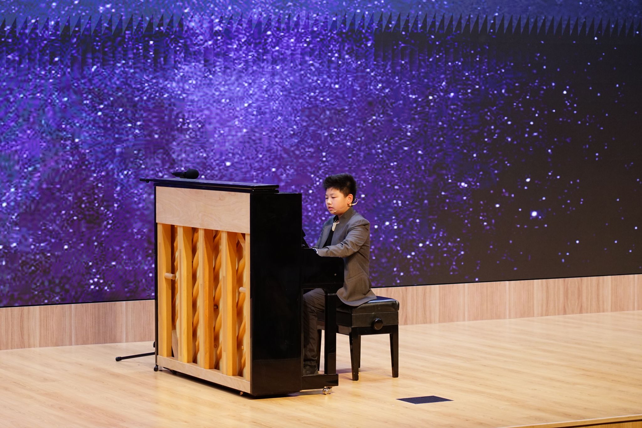 演出在轻快明朗的器乐合奏《无忧无虑波尔卡》中拉开帷幕。Audrey、Zoey、Kate、Sofia、Paris、Vanellope与Viviana默契配合,流畅的旋律在礼堂中回荡,为整场演出奠定了轻松愉悦而富有活力的基调。Chloe的钢琴独奏《C小调即兴幻想曲》以流畅的指法与层次丰富的情感表达,带领观众走进音乐的世界。