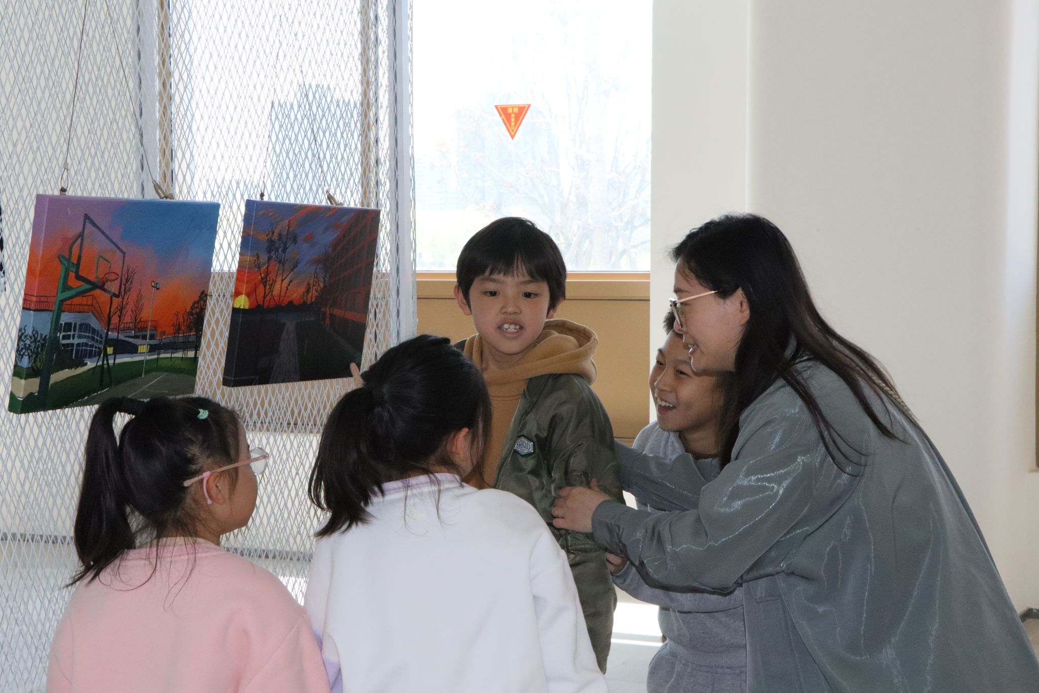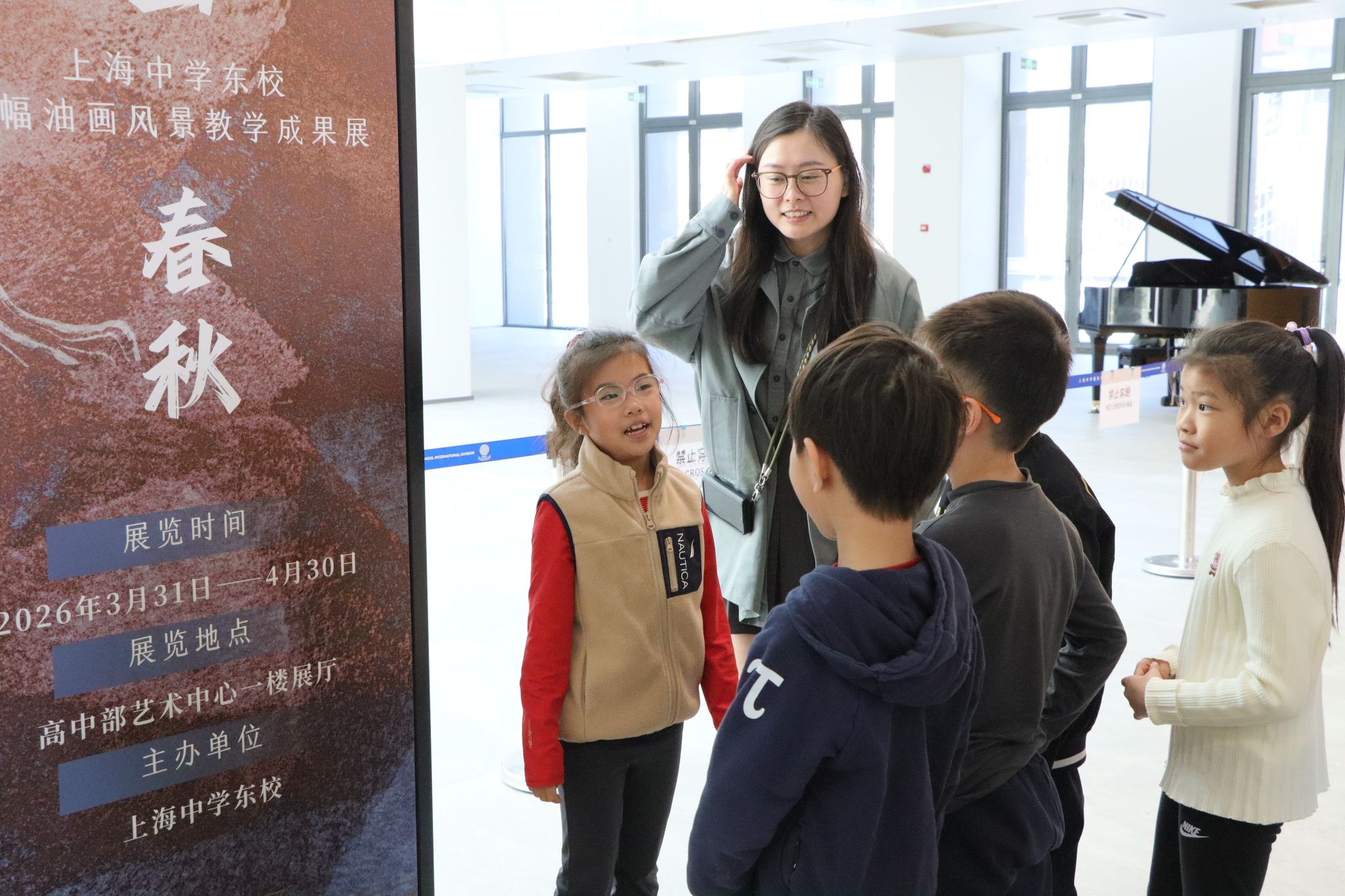 上海中学国际部临港校区一至三年级的小朋友们,利用美术课和课间时间,也走进了这个充满艺术气息的展览,开展了一次别开生面的美育实践课。走进展厅,孩子们立刻被一幅幅精致的小幅油画吸引。“哇,好小的画!”“这幅画里的天空好美!”惊叹声此起彼伏。