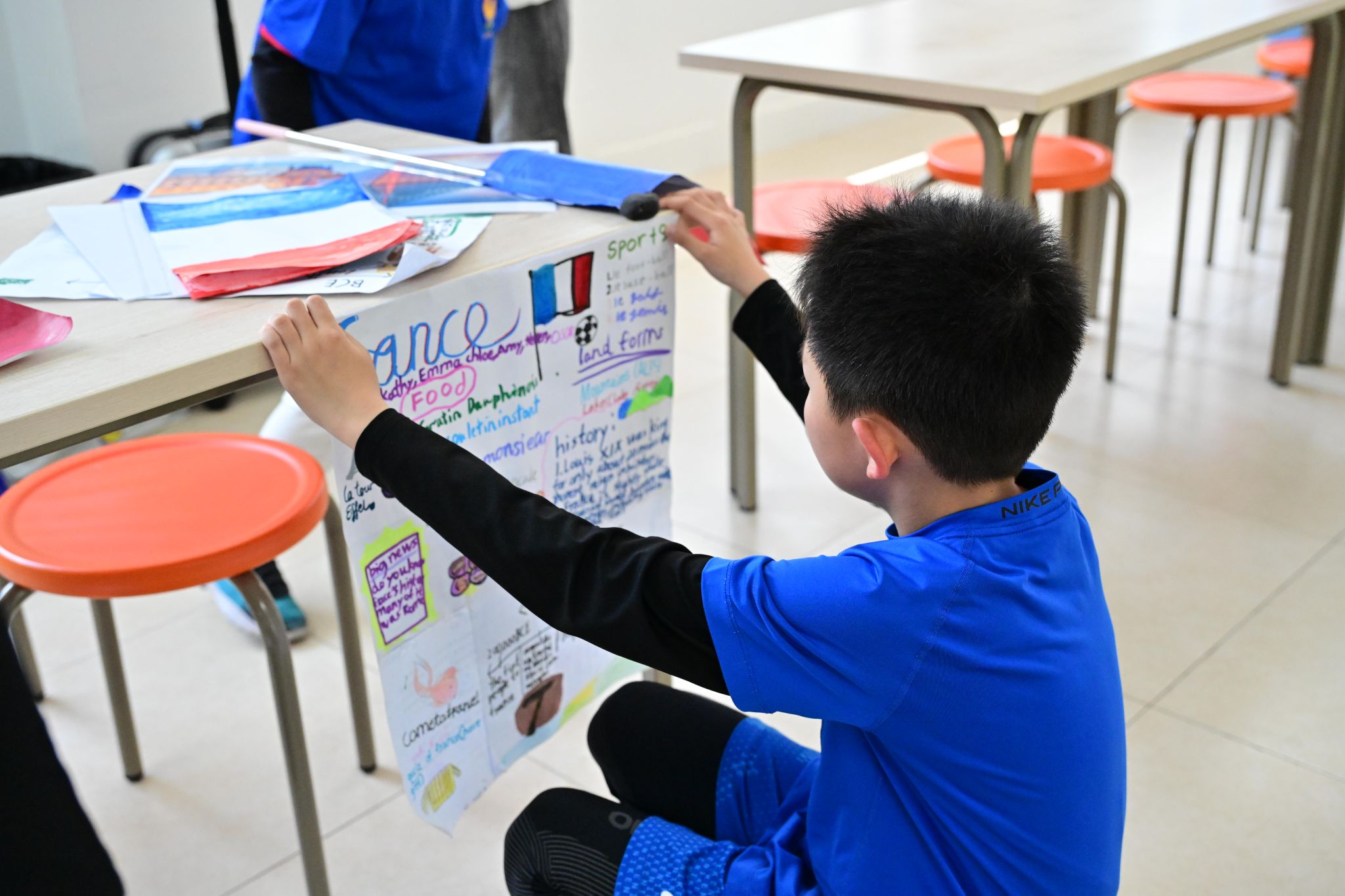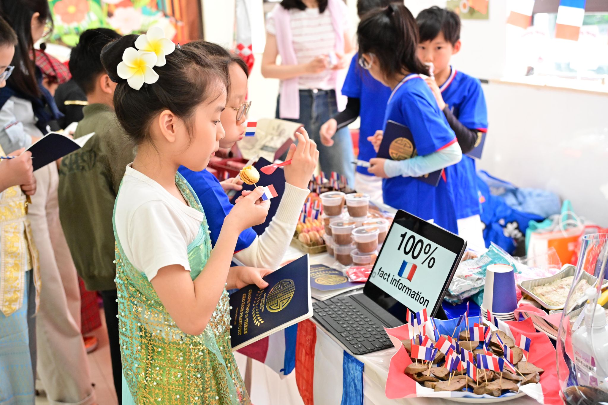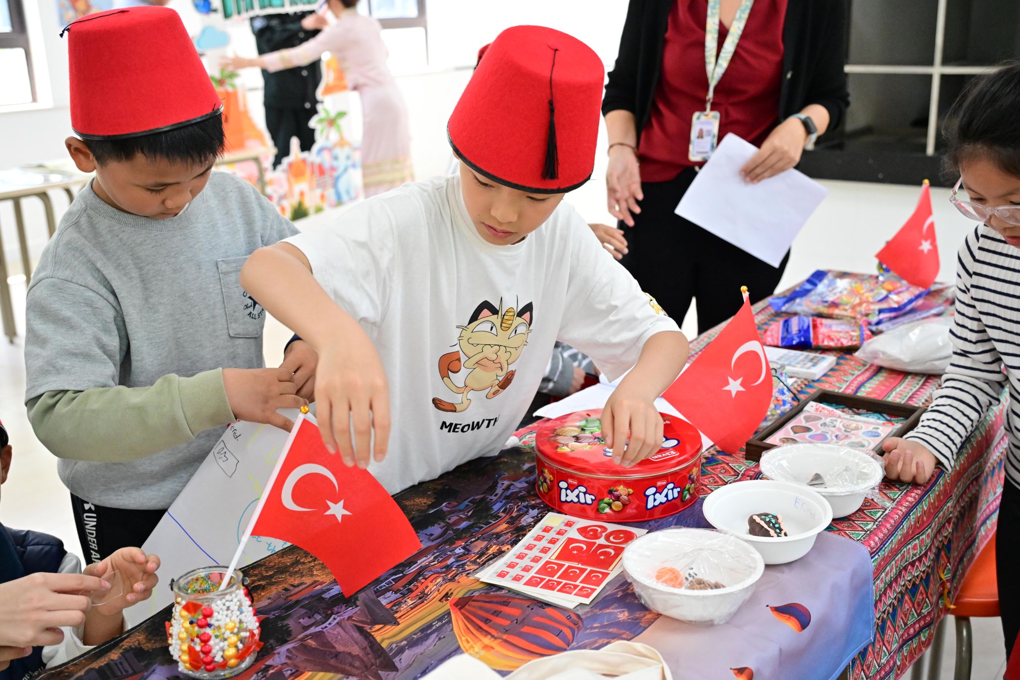 三年级小朋友们相较以往,更加独立自主,全程动手参与筹备工作。3(1)班负责展示泰国、苏格兰与法国,3(2)班则聚焦喀麦隆、印度和土耳其。大家小组合作、分工配合,亲自设计展位、搜集相关的知识、制作趣味展示内容,无论是视觉展板还是趣味互动环节,每个小组都精心策划,全力展现本国特色,生动传递多元文化知识。
