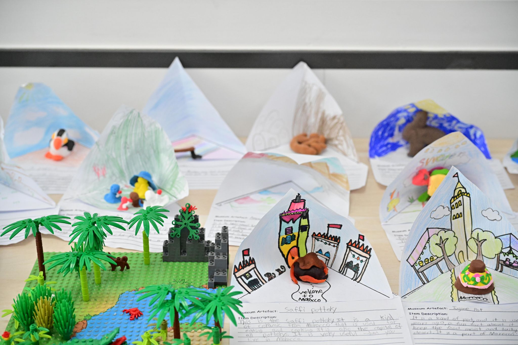 二年级同学则巧用立体情景手工作品探索各国文化,通过搭建模型、设计主题背景,还原特色器物与文化符号,直观展示各国人文风貌。2(1)班精心制作大量精美手工,呈现澳大利亚、秘鲁、冰岛的特色风情;2(2)班用心创作展品,生动还原俄罗斯、瑞典、摩洛哥的文化特色。