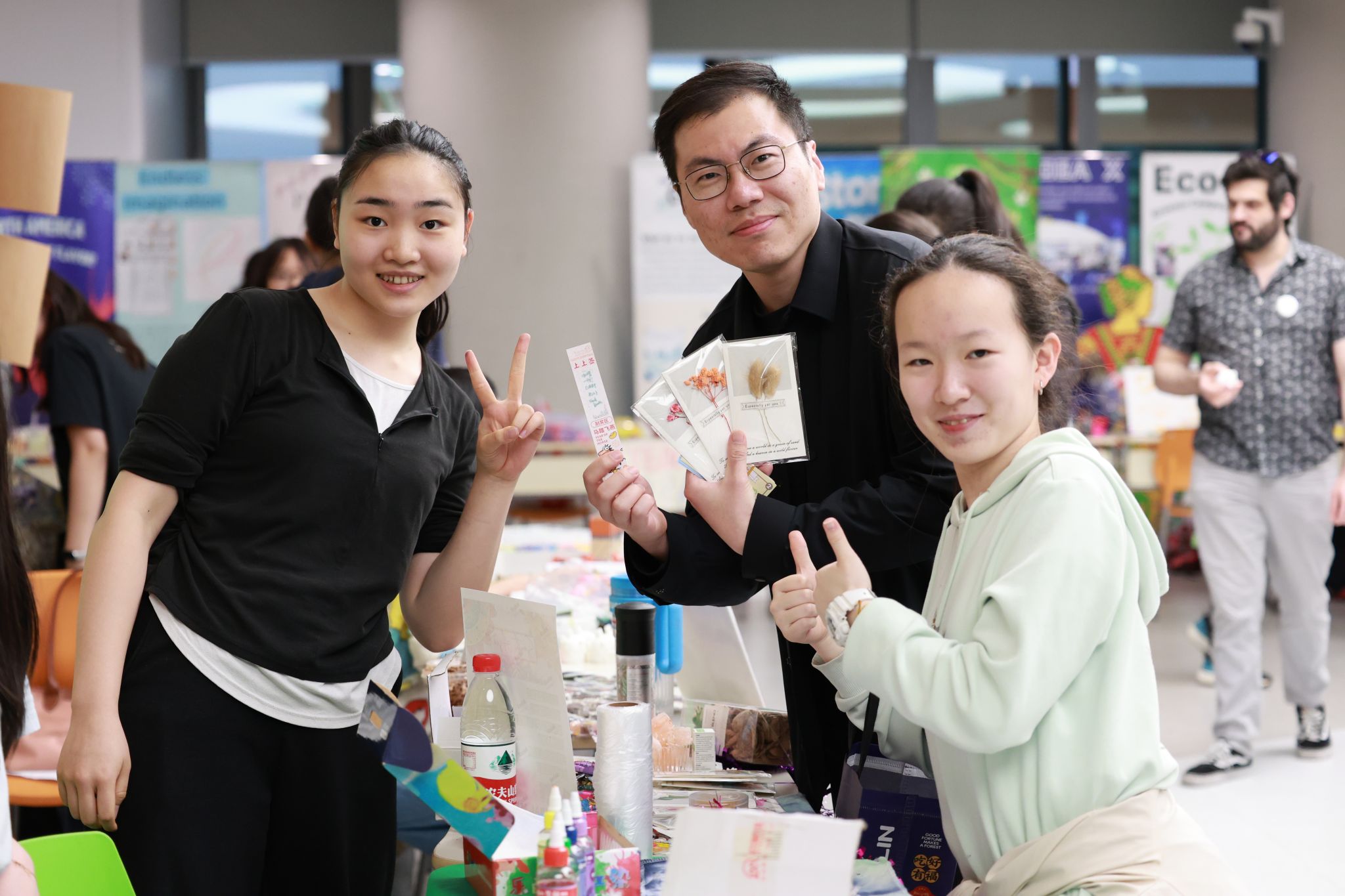 环球市场区域则以手工制品与创意商品为主。有的摊位偏重手绘元素,配有色彩鲜明的海报,有的摊位以简洁的陈列突出商品的精巧设计,也有摊位通过现场讲解或互动吸引同学停留,有的摊位还尝试了简单的组合售卖机制和价格优惠。