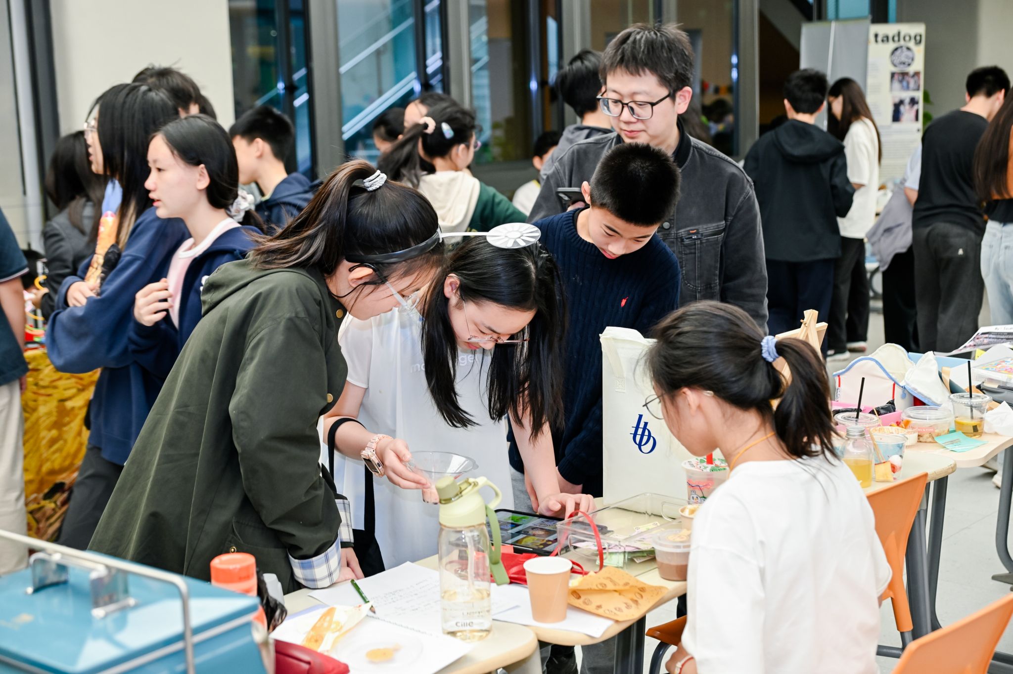 在摊位区域,七年级与八年级的服务性学习(Service Learning)小组进行了配对展示。各班级通过海报或现场互动介绍服务性学习小组的活动内容。此外,也有部分服务性学习小组设置了现场互动摊位。例如,Unistar小组带来了受助学生的绘画作品文创;SciAcademy小组设置了模拟海洋净化的互动游戏;Primo小组则带来了数学主题帆布袋等设计产品。